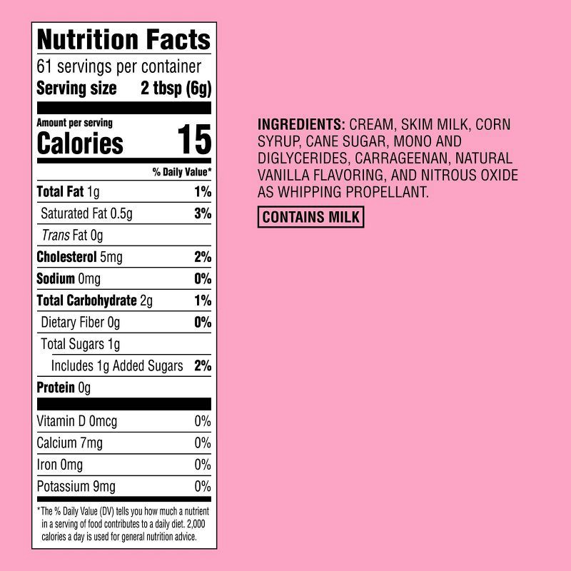 CREAM, WATER, CORN SYRUP, CANE SUGAR, NONFAT DRY MILK, MONO- AND DIGLYCERIDES, DEXTROSE, CARRAGEENAN, VANILLA EXTRACT, NITROUS OXIDE.