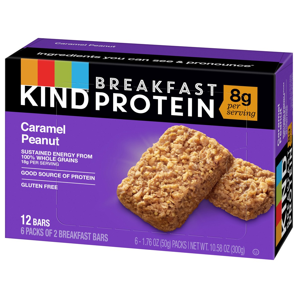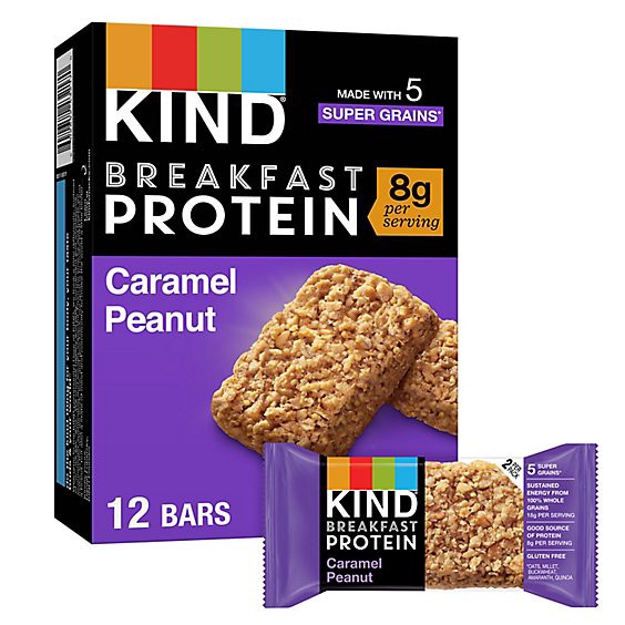 KIND Breakfast Caramel Peanut Protein bars are wholesome snack bars made from 100% whole grains for sustained energy. KIND Caramel Peanut Breakfast Protein bars are made with five super grains—oats, bu…