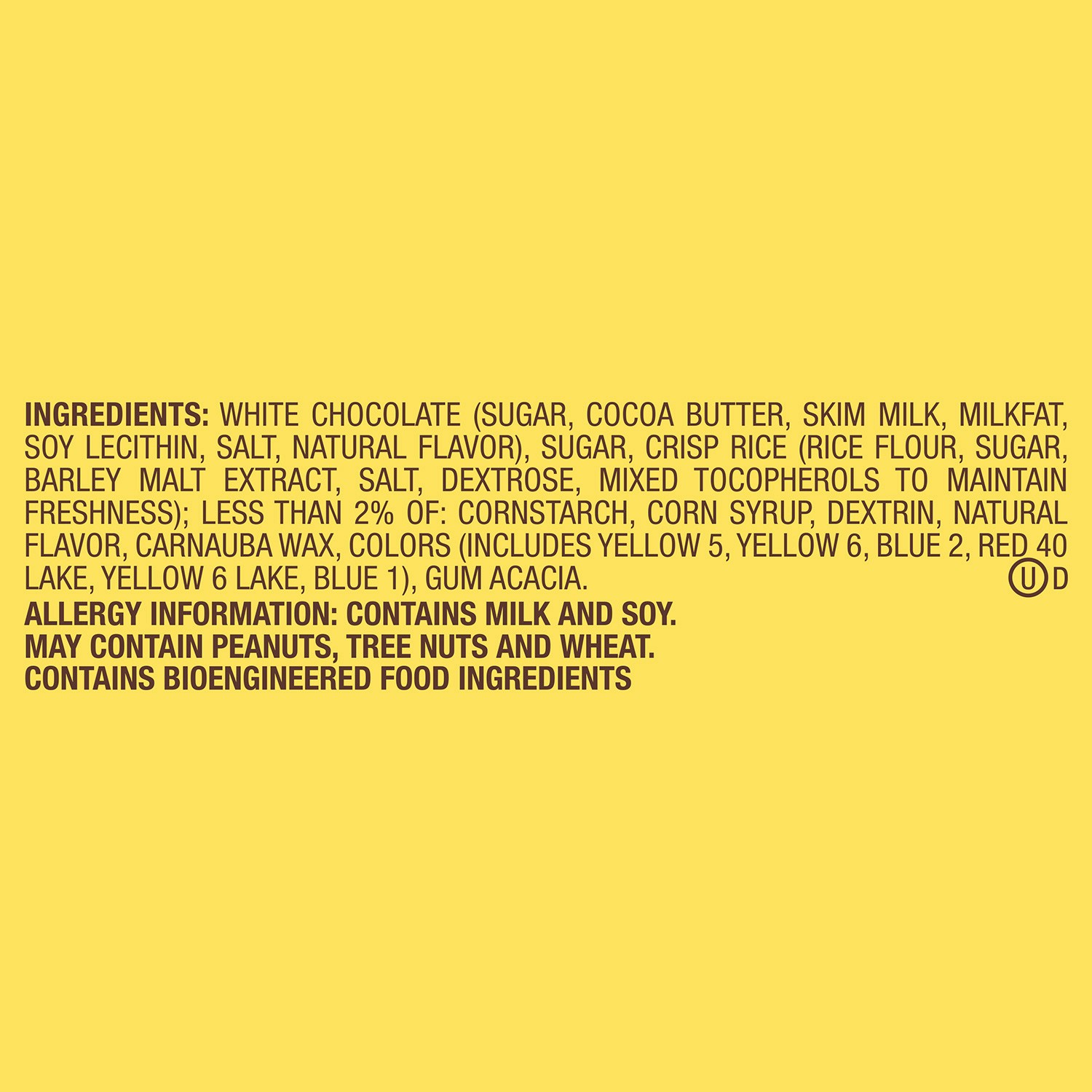 WHITE CHOCOLATE (SUGAR, COCOA BUTTER, SKIM MILK, MILKFAT,SOY LECITHIN, SALT, NATURAL FLAVOR), SUGAR, CRISP RICE (RICE FLOUR, SUGAR,BARLEY MALT EXTRACT, SALT, DEXTROSE, MIXED TOCOPHEROLS TO MAINTAINFRE…