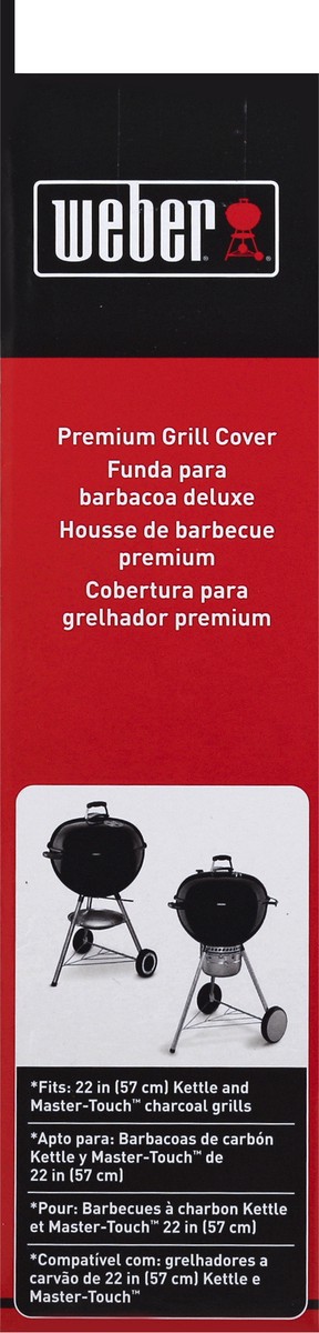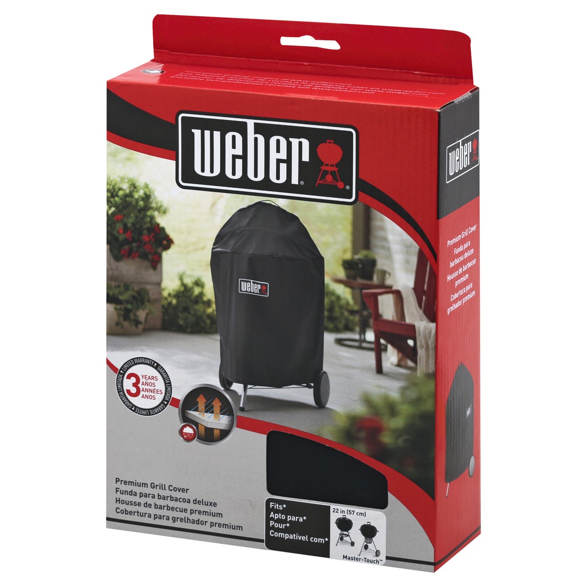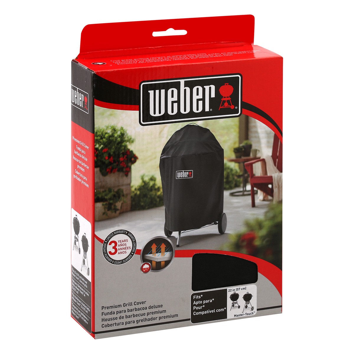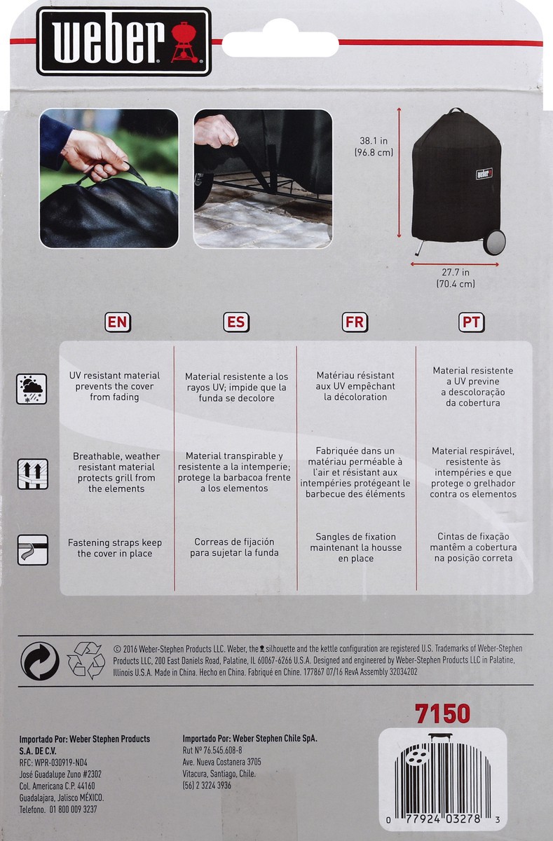 38.1 in (96.8 cm) x 27.7 in (70.4 cm). Fits: 22 in (57 cm) Kettle and Master-Touch Charcoal Grills. UV resistant material prevents the cover from fading. Breathable, weather resistant material protect…