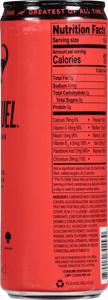 Carbonated Water, Citric Acid, Taurine, Natural Flavors, Glucuronolactone, Malic Acid, Natural Caffeine, Fruit And Vegetable Juice (Color), Sucralose, Potassium Citrate, Bcaa 2:1:1 (L-Leucine, L-Isoleā¦