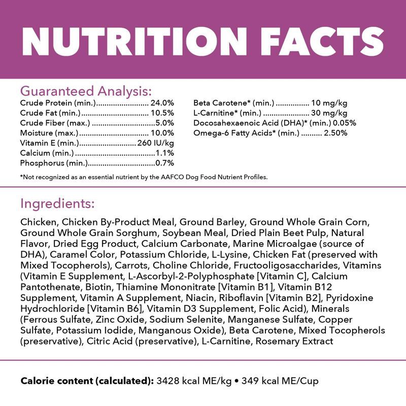 - Immune System Support: This dry dog food is crafted with an antioxidant blend which includes Vitamin E and Beta Carotene to help boost immune response of older dogs to healthy adult levels.