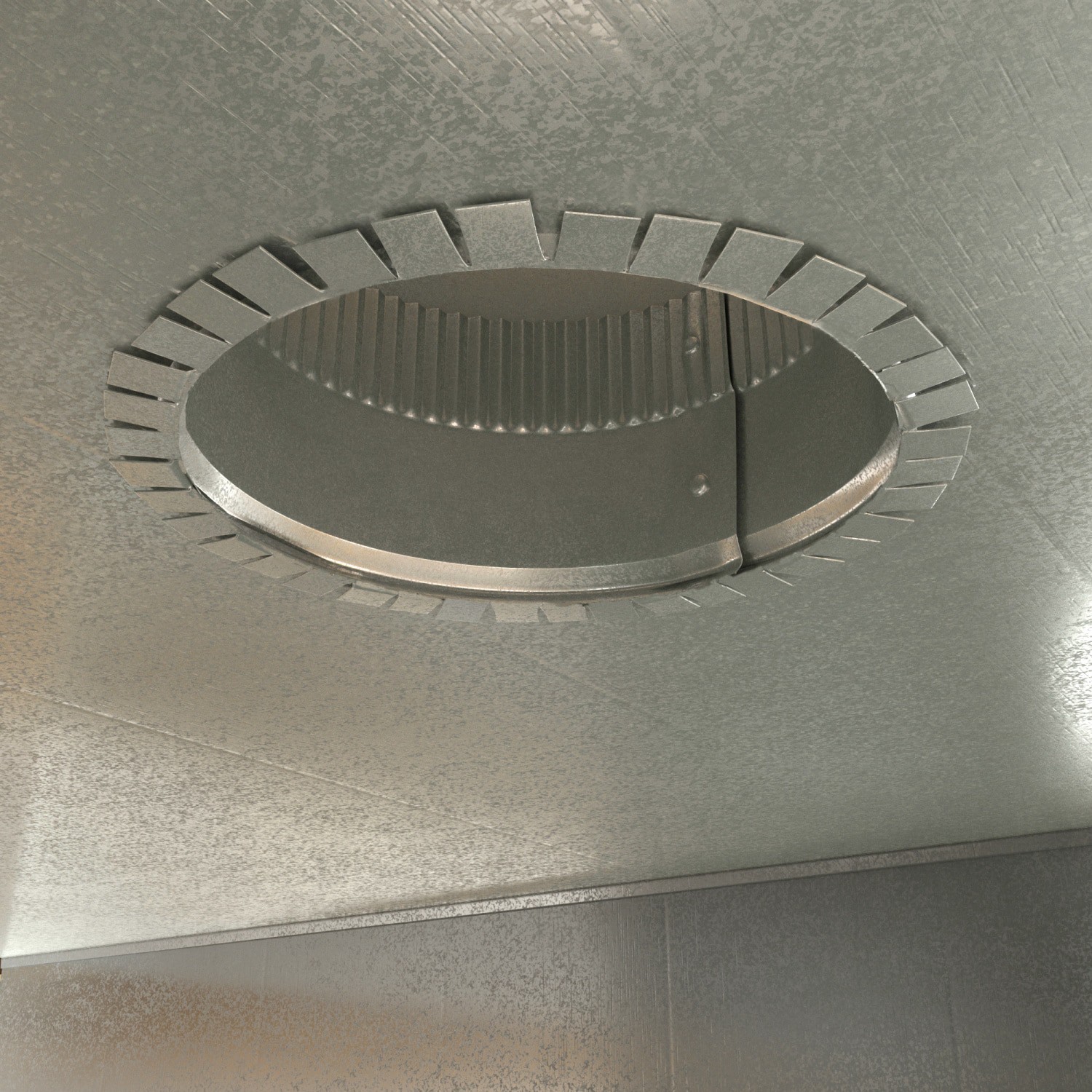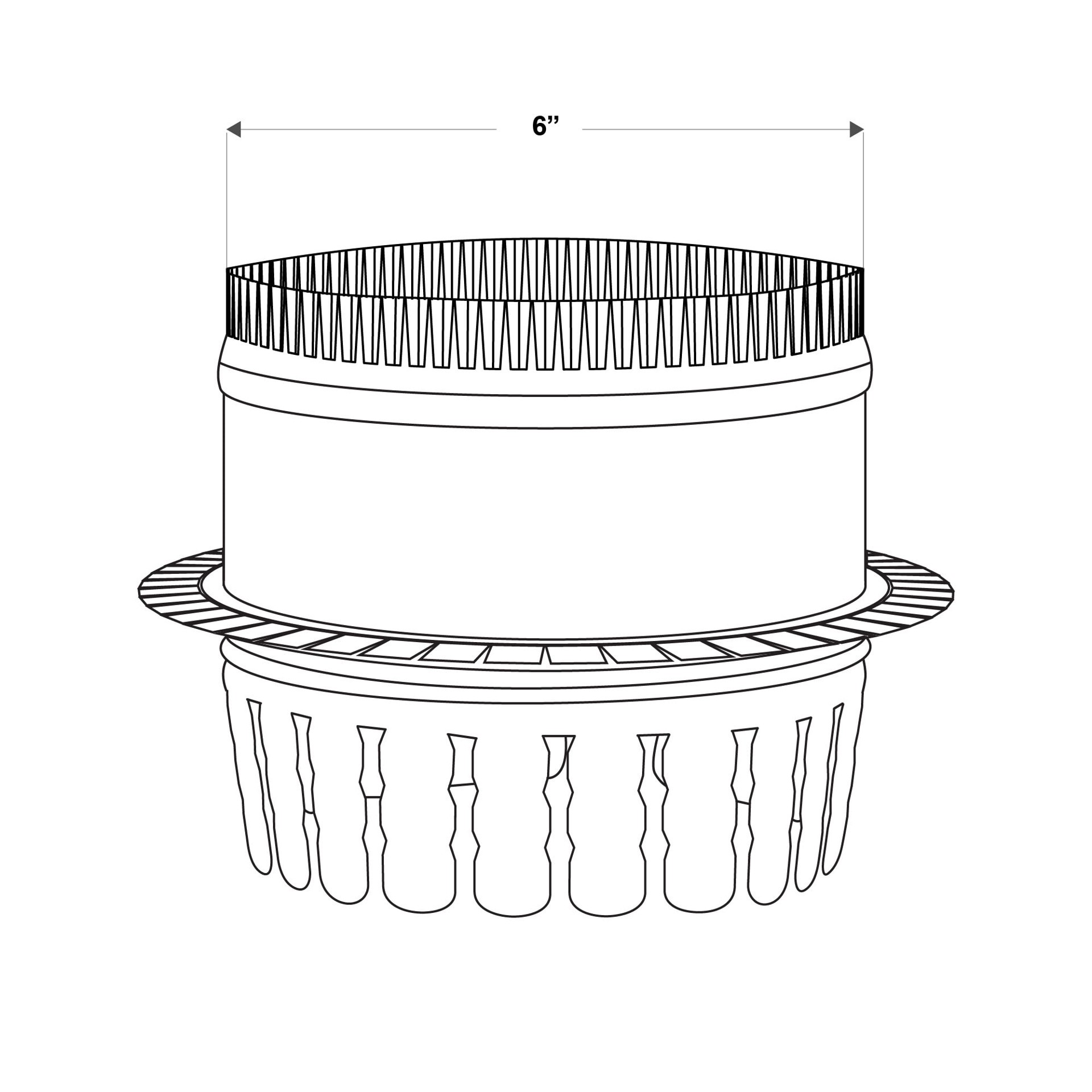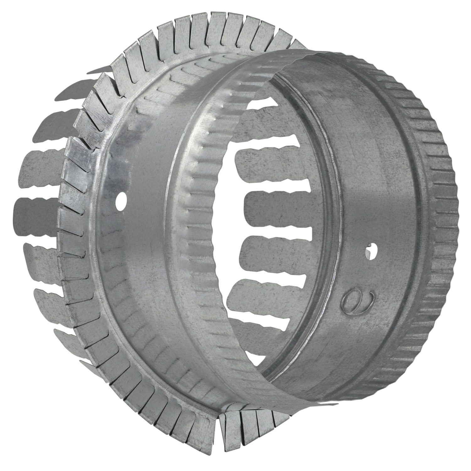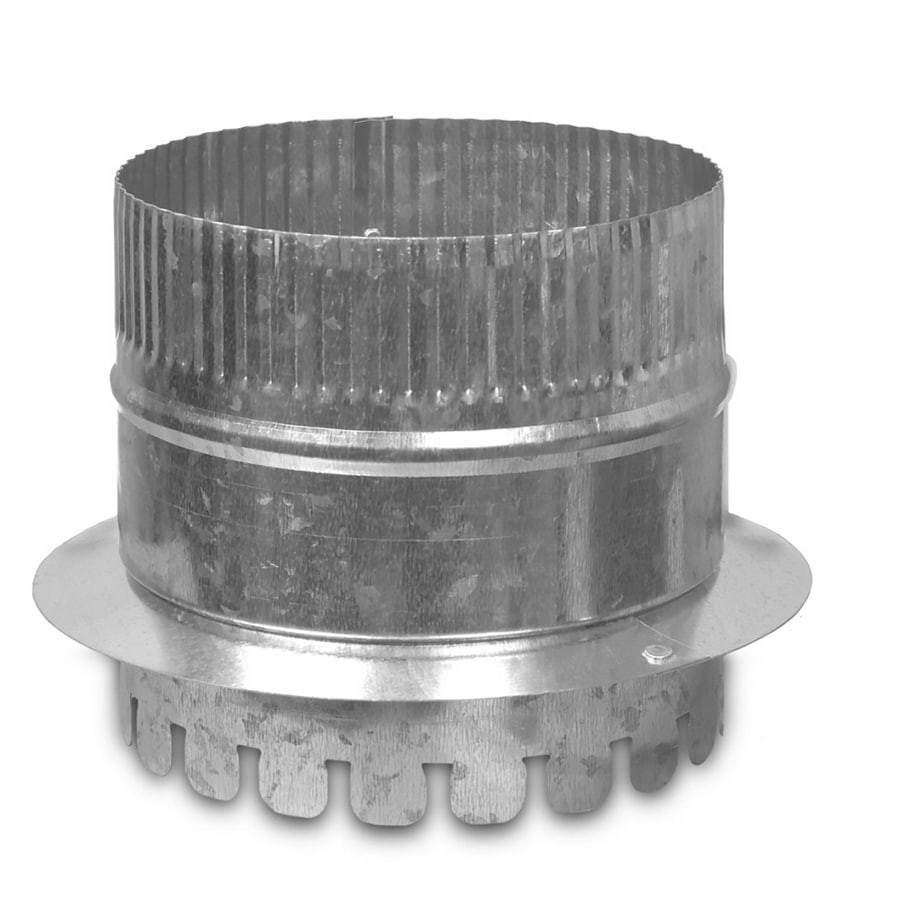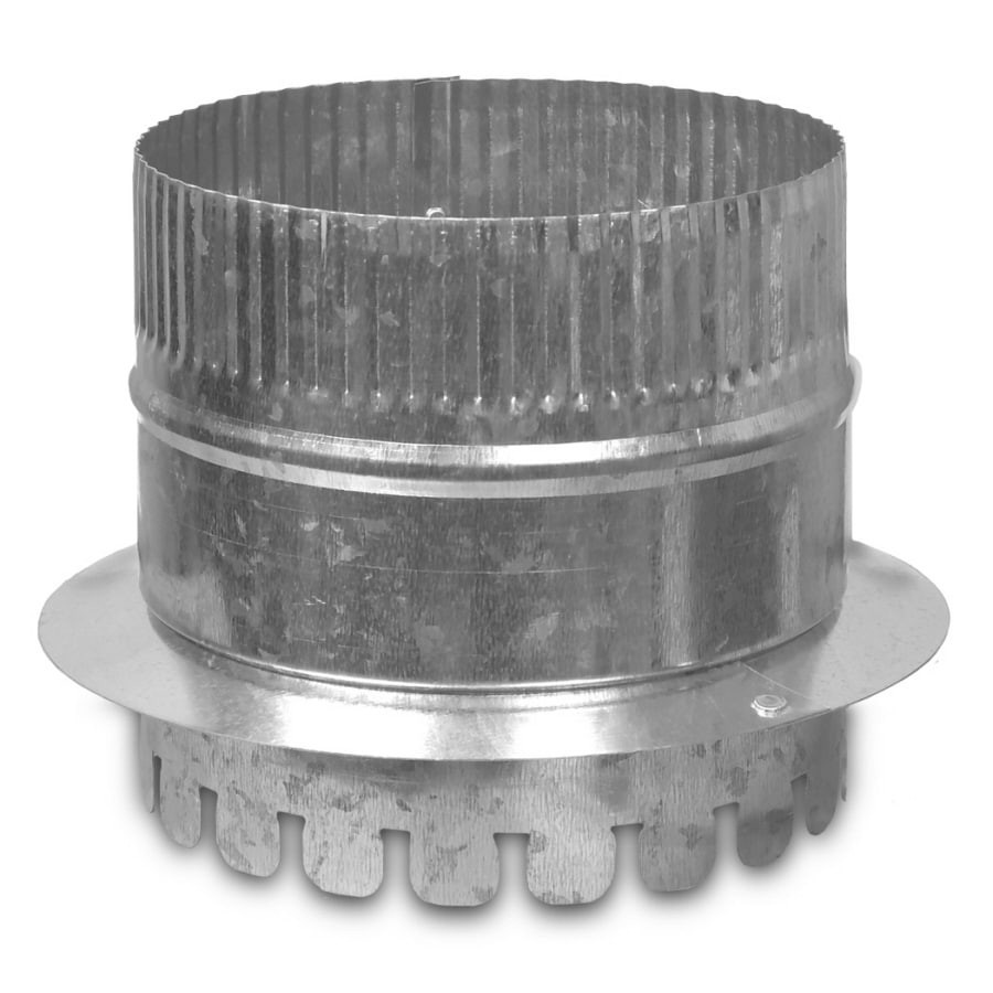 Used to transition from a flat surface to round pipe or insulated flexible duct. For use with duct board, internally lined plenum, or unlined plenum. Features extra-long tabs to fit most R6 duct board…