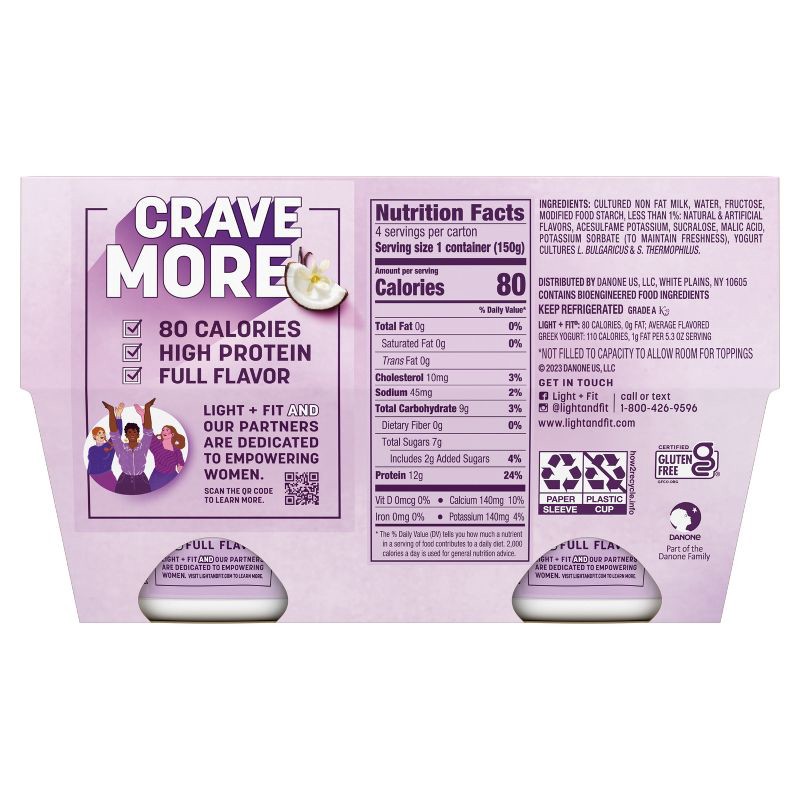 Light + Fit Nonfat Gluten-Free Toasted Coconut Vanilla Greek Yogurt - 12g Protein 4ct/5.3oz Cups