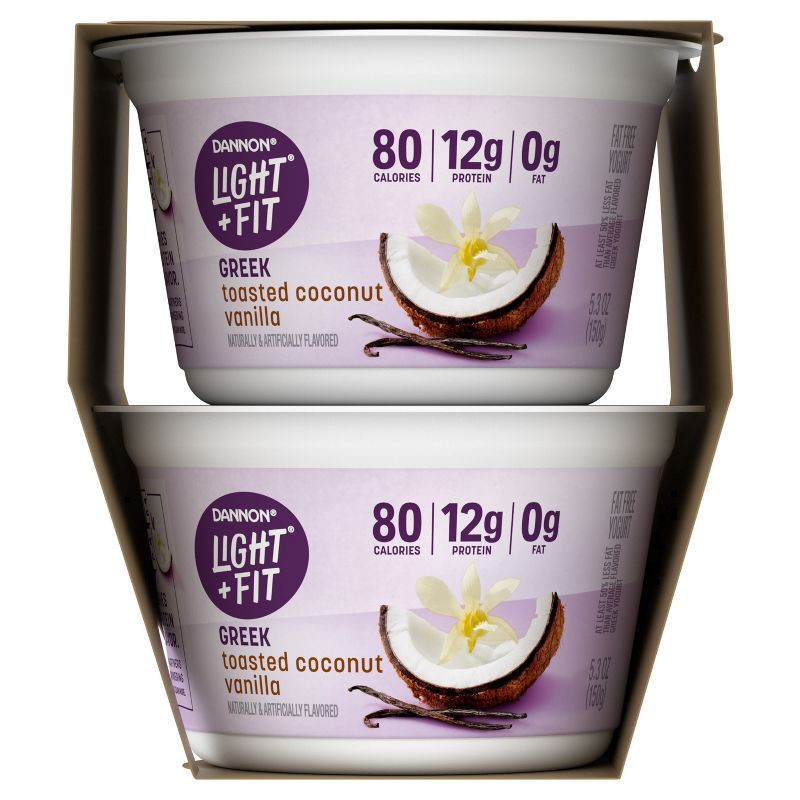 - JUST GRAB YOUR SPOON AND ENJOY: One 4-count yogurt pack of 5.3 oz Dannon Light + Fit Toasted Coconut Vanilla Greek Fat Free Yogurt Cups