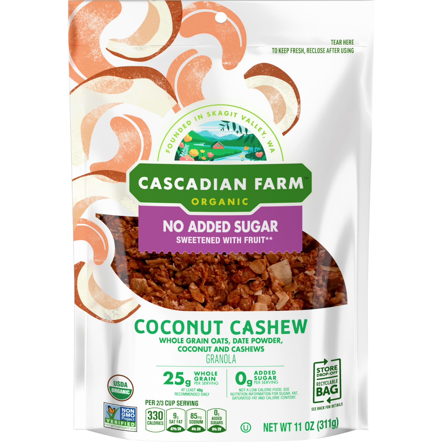 Cascadian Farm Organic No Added Sugar Coconut Cashew Granola comes with delicious whole-grain oats, date powder, coconut and cashews. With 25 grams of whole grain* per serving, this organic granola he…