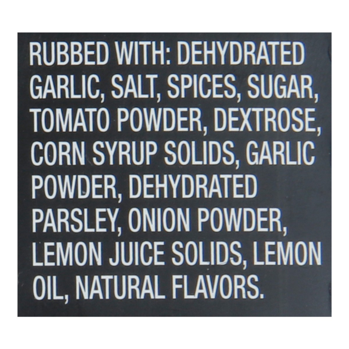Rubbed with: Dehydrated Garlic, Salt, Spices, Sugar, Tomato Powder, Dextrose, Corn Syrup Solids, Garlic Powder, Dehydrated Parsley, Onion Powder, Lemon Juice Solids, Lemon Oil, Natural Flavors.