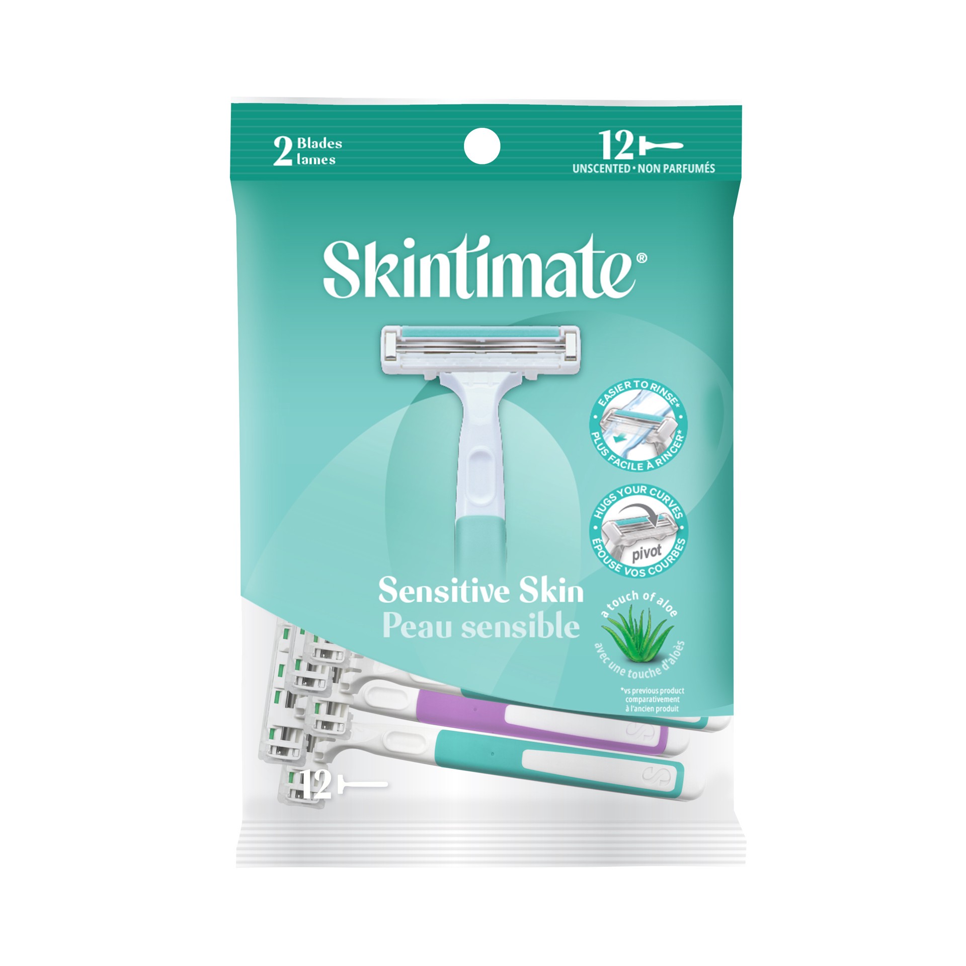 Skintimate Twin Blade Disposable Razors, 12ct. Easier to rinse (vs. previous product). Pivoting head hugs your curves. With a touch of aloe. Ideal for sensitive skin. Close precise shave