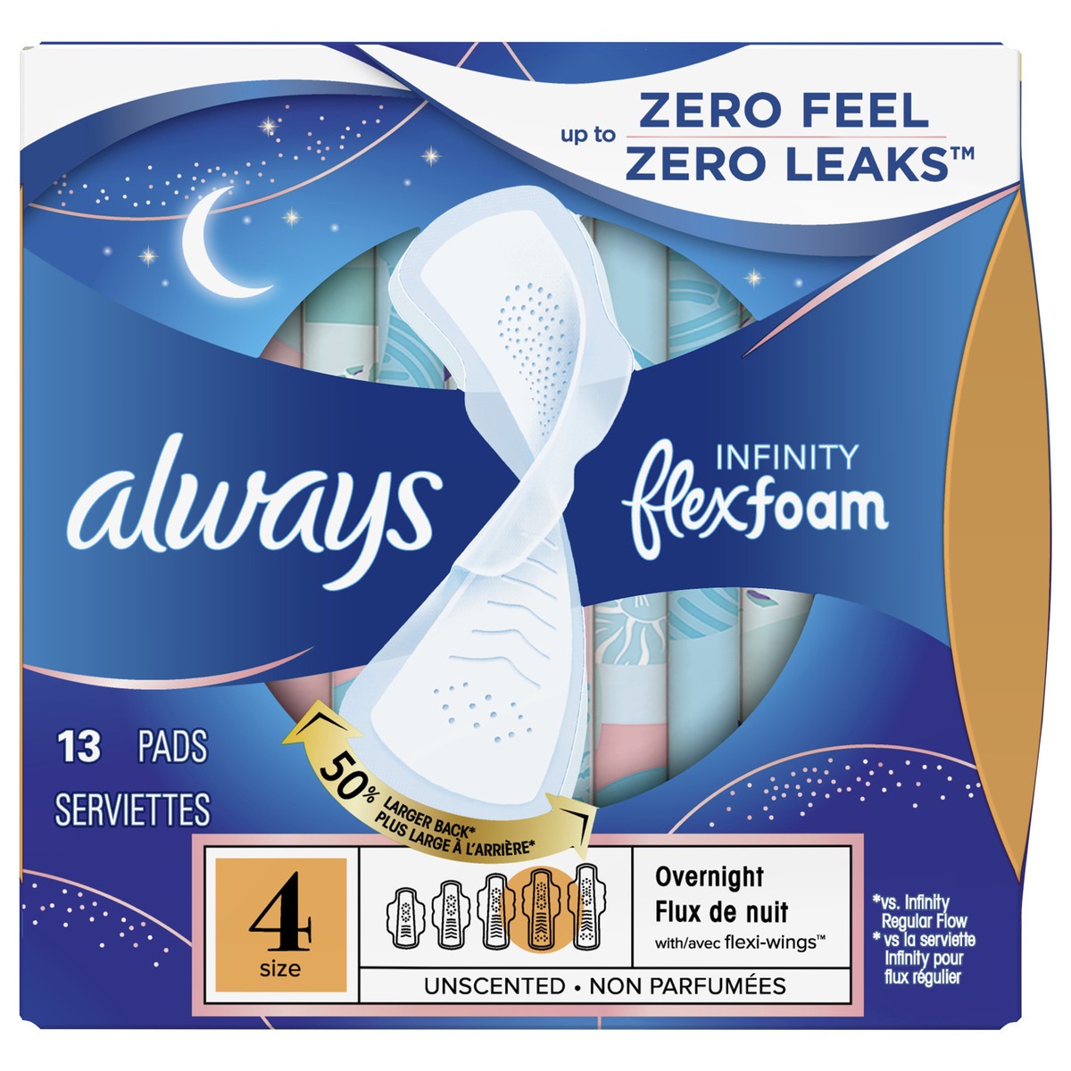 Up to zero feel, zero leaks. 50% larger back (vs. Infinity Regular Flow). Always My Fit. Panty Size: Flow: Moderate 4. Great for day. Great for night. Super absorbent holes. Our driest breathable top …