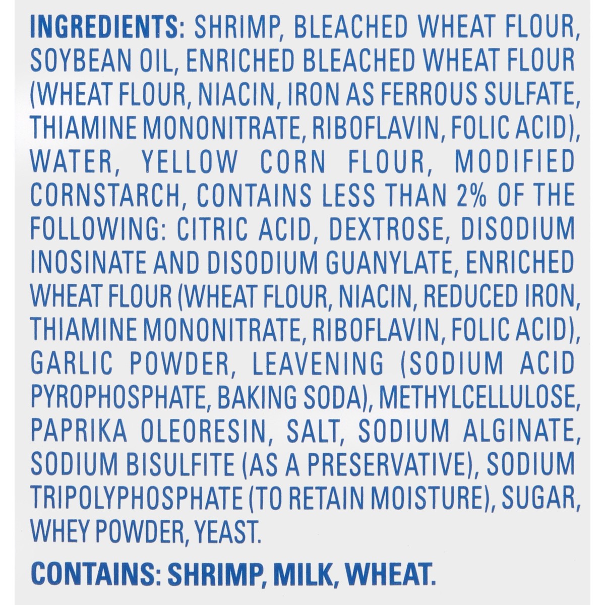 Shrimp, Bleached Wheat Flour, Soybean Oil, Enriched Bleached Wheat Flour (Wheat Flour, Niacin, Iron as Ferrous Sulfate, Thiamine Mononitrate, Riboflavin, Folic Acid), Water, Yellow Corn Flour, Modifie…