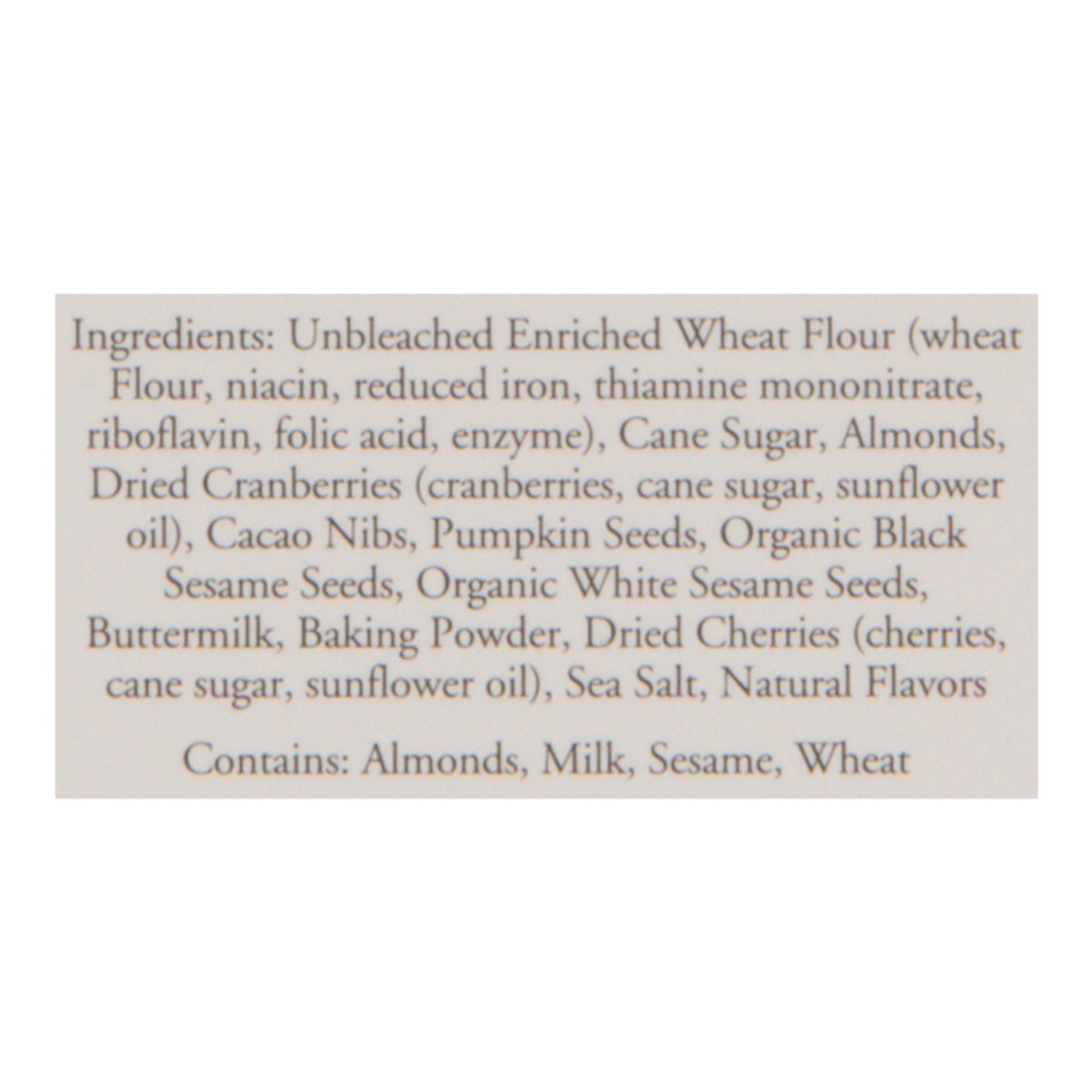 Unbleached Enriched Wheat Flour (Wheat Flour, Niacin, Reduced Iron, Thiamine Mononitrate, Riboflavin, Folic Acid, Enzyme), Cane Sugar, Almonds, Dried Cranberries (Cranberries, Cane Sugar, Sunflower Oi…