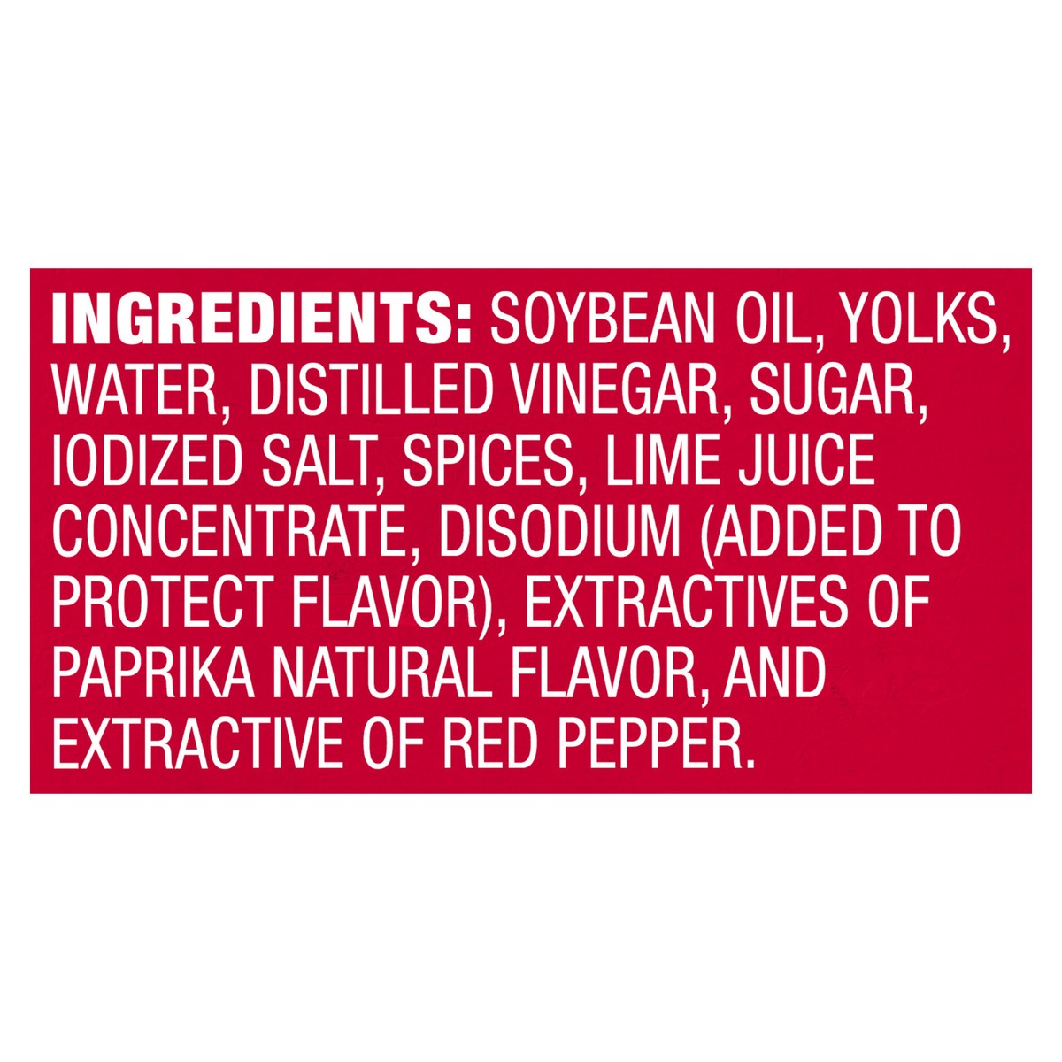 Soybean Oil, Egg Yolks, Water, Distilled Vinegar, Sugar, Iodized Salt, Spices, Lime Juice Concentrate, Disodium EDTA (Added to Protect Flavor), Extractives of Paprika, Natural Flavor, and Extractives …
