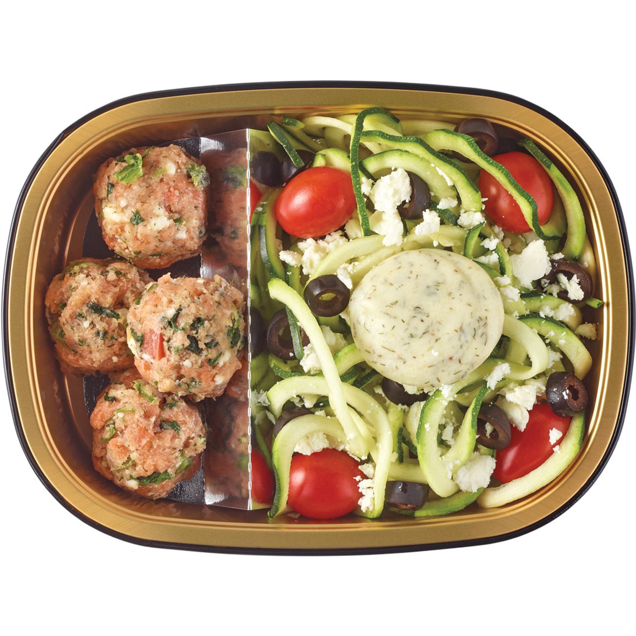 Zucchini, Greek-Style Salmon Meatballs (Atlantic Salmon [Color Added Through Feed], Green Bell Peppers, Diced Tomatoes, Feta Cheese [Pasteurized Milk And Skim Milk, Salt, Enzymes {Animal}, Cheese Cult…