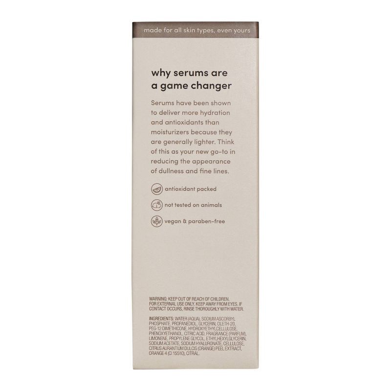 Water (Aqua), Sodium Ascorbyl Phosphate, Propanediol, Glycerin, Oleth-20, PEG-12 Dimethicone, Hydroxyethylcellulose, Phenoxyethanol, Citric Acid, Fragrance (Parfum), Limonene, Propylene Glycol, Ethylh…