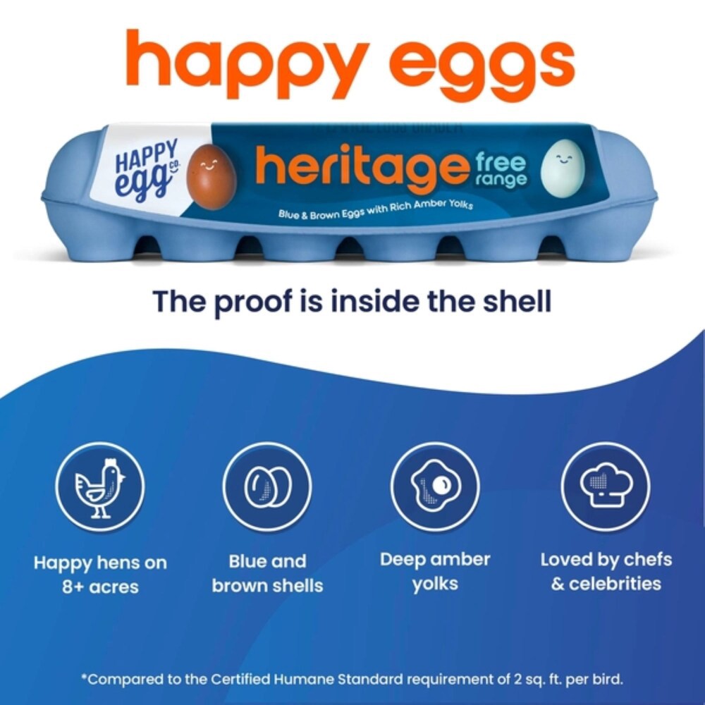Happy Egg Heritage Breed Free Range Grade A eggs are rich in flavor and appearance. These brown and blue eggs contain plump amber yolks with a creamy flavor that will make any dish feel gourmet. There…