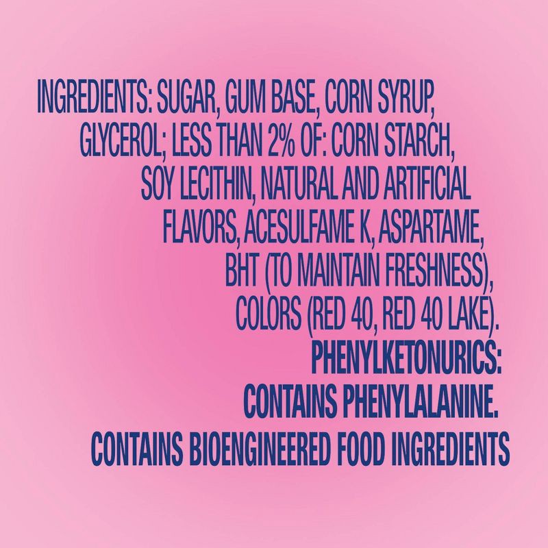 Sugar, Gum Base, Corn Syrup, Glycerol; Less than 2% of: Corn Starch, Soy Lecithin, Natural and Artificial Flavors, Acesulfame K, Aspartame, BHT (to Maintain Freshness), Colors (Red 40, Red 40 Lake).