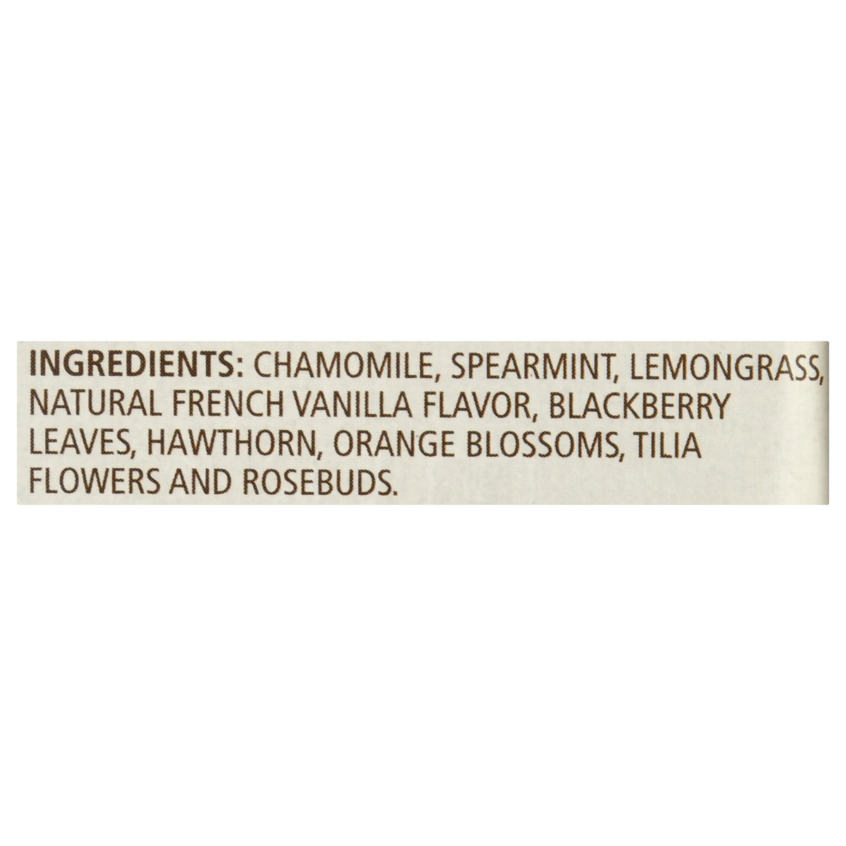 Chamomile, Spearmint, Lemongrass, Natural Vanilla Flavor with Other Natural Flavors, Blackberry Leaves, Hawthorn, Tilia Flowers, Rosebuds.