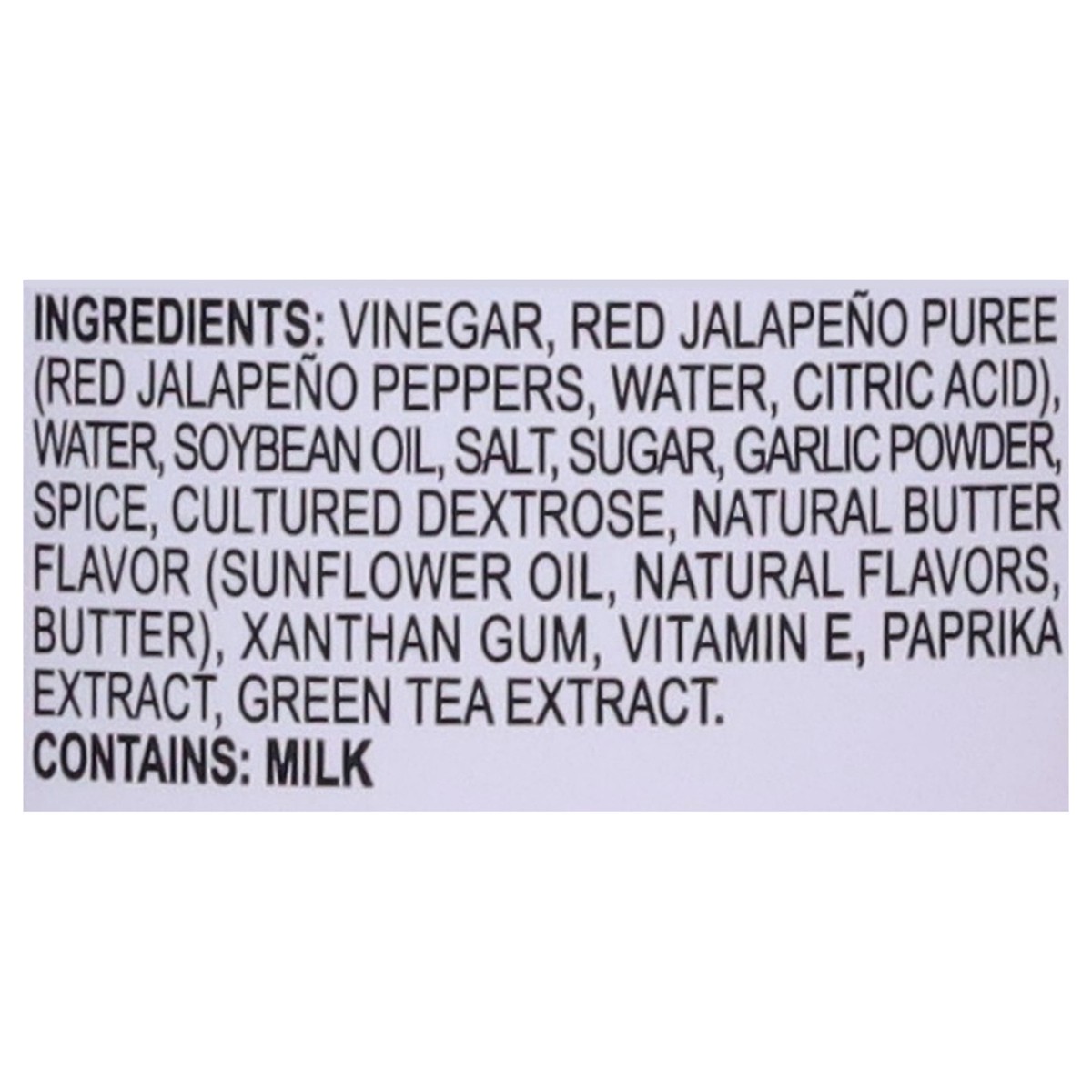 Vinegar, Red Jalapeno Puree (Red Jalapeno Peppers, Water, Citric Acid), Water, Soybean Oil, Salt, Sugar, Garlic Powder, Spice, Cultured Dextrose, Natural Butter Flavor (Sunflower Oil, Natural Flavors,…