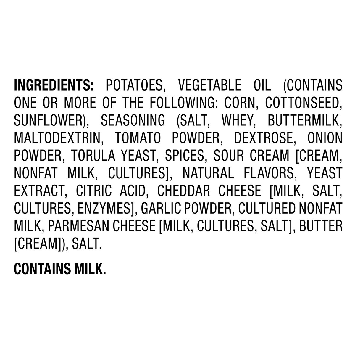 Potatoes, Vegetable Oil (Contains One or More of the Following: Corn, Cottonseed, Sunflower), Seasoning (Salt, Whey, Buttermilk, Maltodextrin, Tomato Powder, Dextrose, Onion Powder, Torula Yeast, Spic…