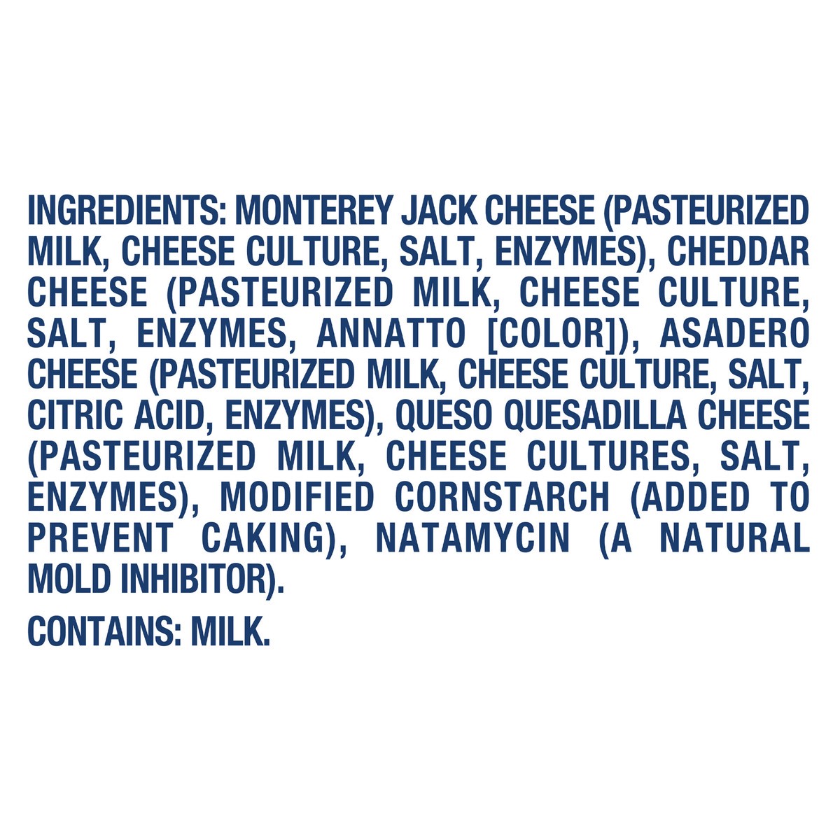 Monterey Jack Cheese (Pasteurized Milk, Cheese Culture, Salt, Enzymes), Cheddar Cheese (Pasteurized Milk, Cheese Culture, Salt, Enzymes, Annatto [Color]), Asadero Cheese (Pasteurized Milk, Cheese Cult…