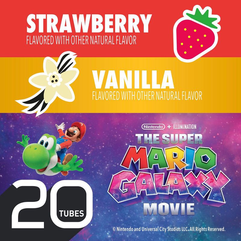 - OUT OF THIS WORLD FLAVOR: Go on a cosmic taste adventure with strawberry and vanilla flavored yogurt tubes, inspired by The Super Mario Galaxy Movie; Each tube has a question - galaxy fans can slurp down to reveal the surprise answer
