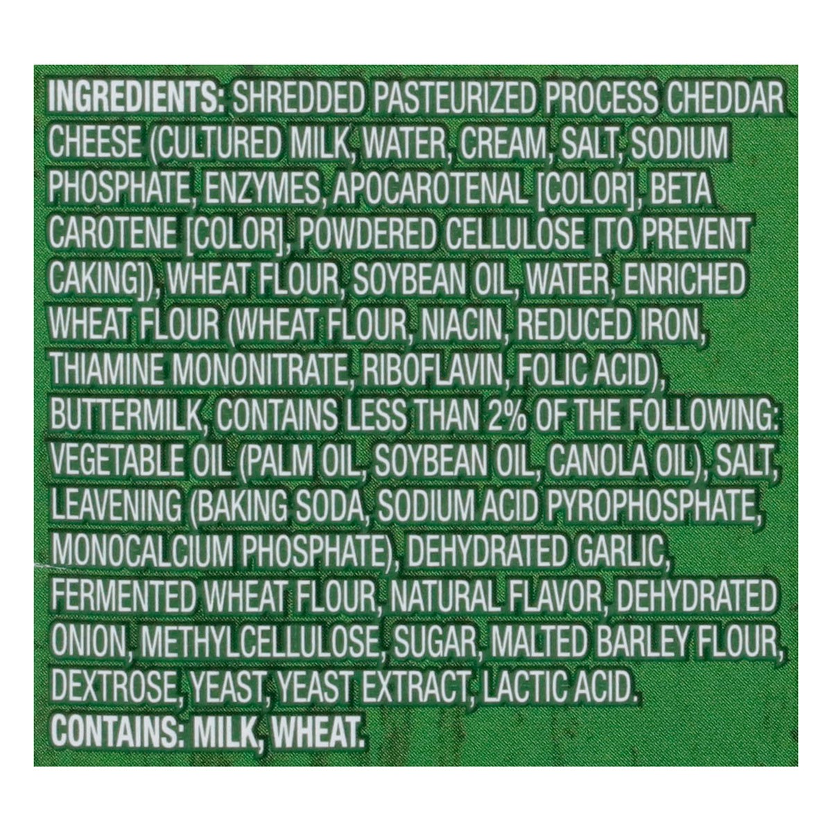 Shredded Pasteurized Process Cheddar Cheese (Cultured Milk, Water, Cream, Salt, Sodium Phosphate, Enzymes, Apocarotenal [Color], Beta Carotene [Color], Powdered Cellulose [to Prevent Caking]), Wheat F…
