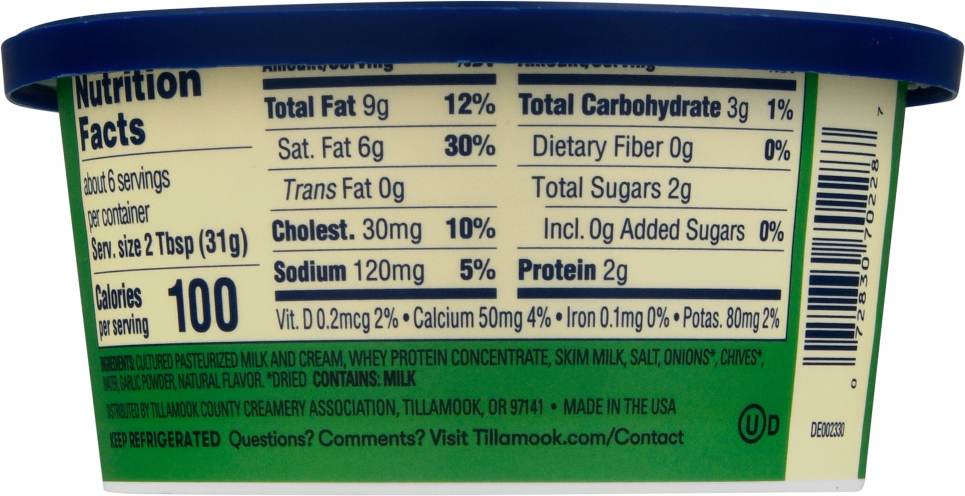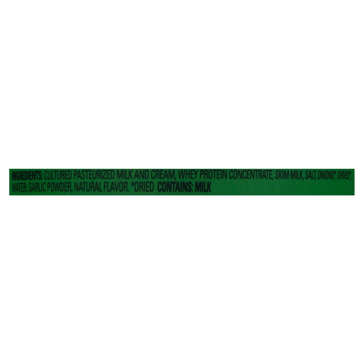 Cultured Pasteurized Milk and Cream, Whey Protein Concentrate, Skim Milk, Salt, Onions (Dried), Chives (Dried), Water, Garlic Powder, Natural Flavor.
