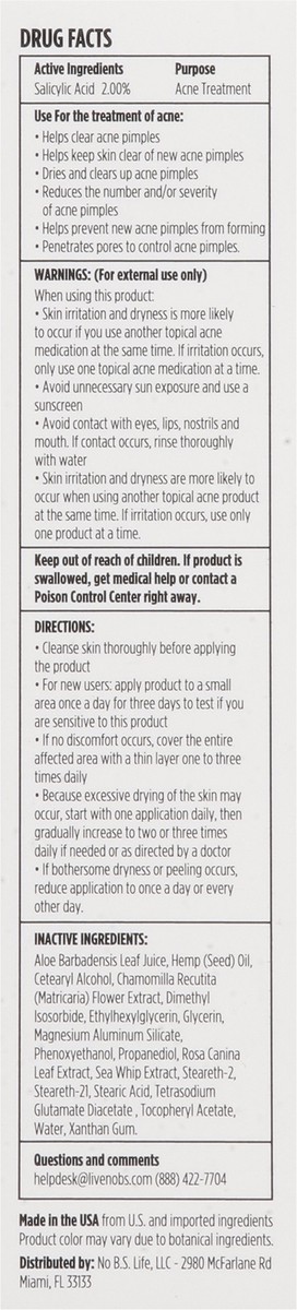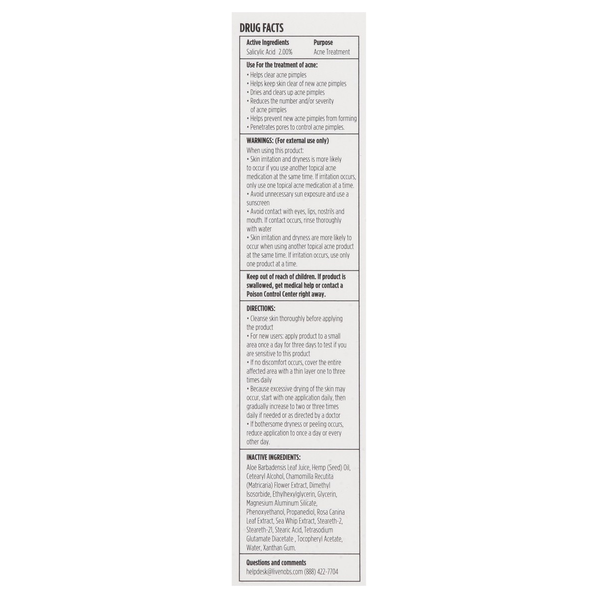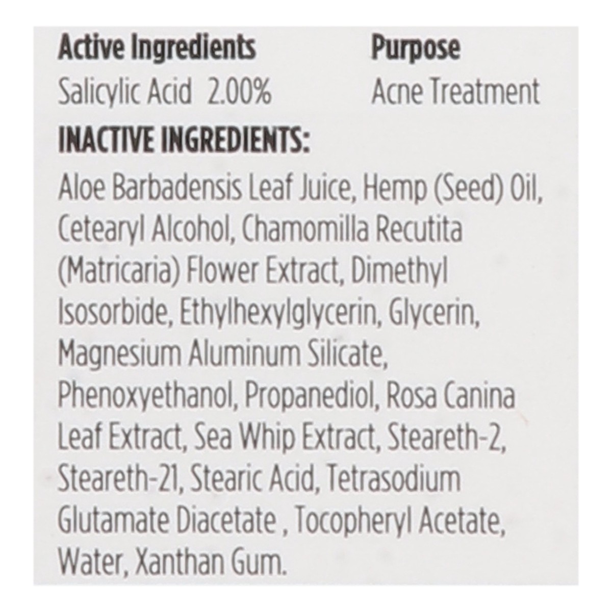 Active Ingredients: Salicylic Acid (2.00 %), Acne Treatment. Inactive Ingredients: Aloe Barbadensis Leaf Juice, Hemp (Seed) Oil, Cetearyl Alcohol, Chamomilla Recutita (Matricaria) Flower Extract, Dime…