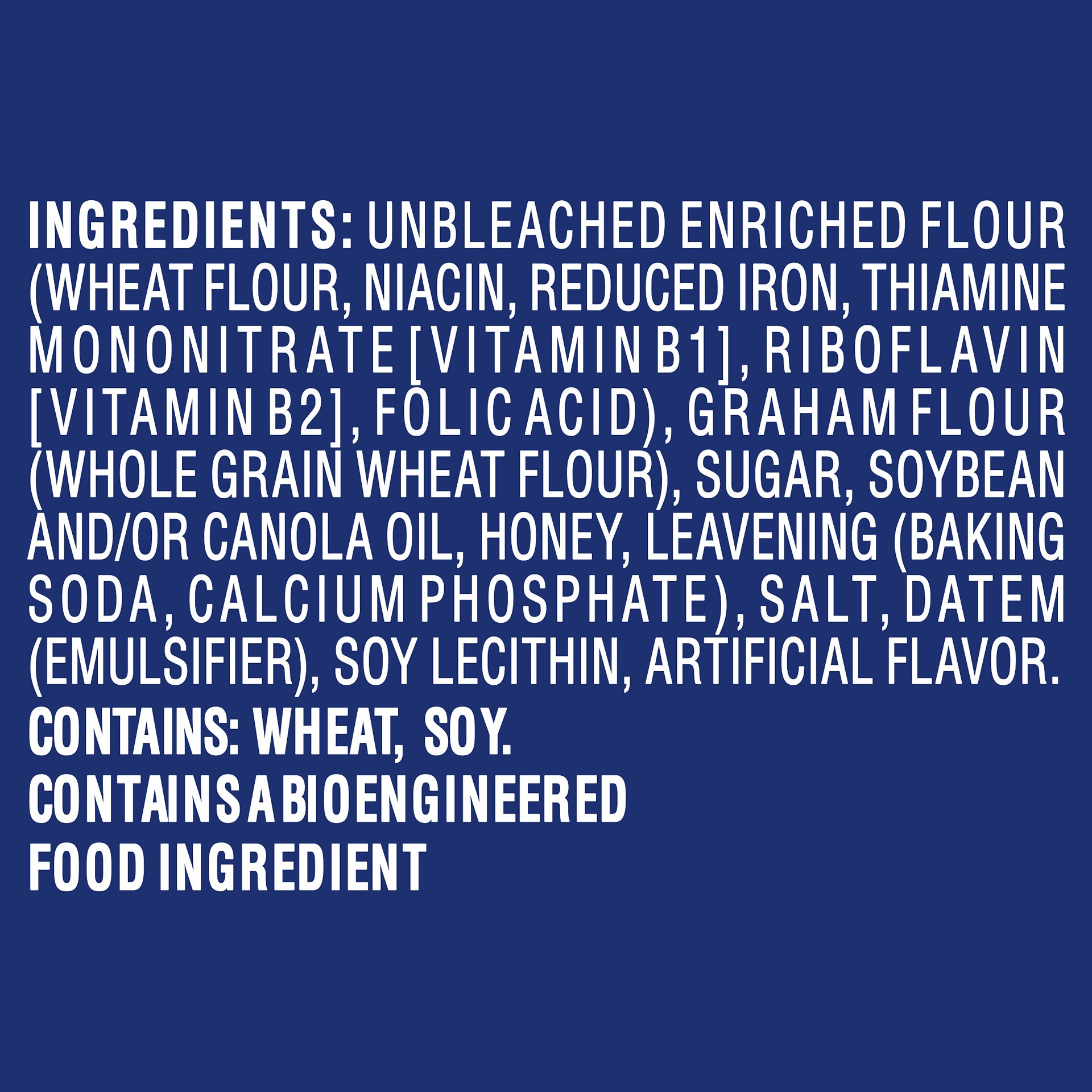 INGREDIENTS: UNBLEACHED ENRICHED FLOUR (WHEAT FLOUR, NIACIN, REDUCED IRON, THIAMINE MONONITRATE [VITAMIN B1], RIBOFLAVIN [VITAMIN B2], FOLIC ACID), GRAHAM FLOUR (WHOLE GRAIN WHEAT FLOUR), SUGAR, SOYBE…