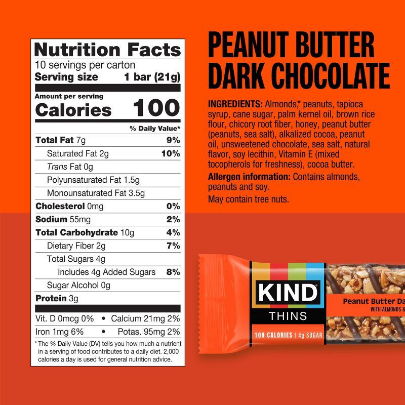 - Ten 0.74 oz KIND THINS Peanut Butter Dark Chocolate gluten free snack bars