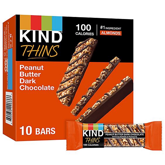 KIND THINS Peanut Butter Dark Chocolate bars are a thinner take on your favorite KIND bar. Each bar is crafted with sliced almonds and roasted peanuts for a chewier crunch and a lighter bite. With alm…