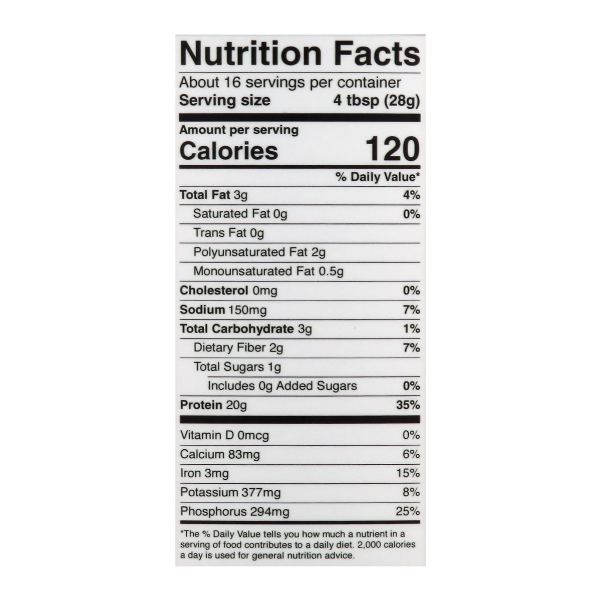 20 g protein (per 28 g per serving). 2 g fiber (per 28 g per serving). 1.9 g omegas 3 & 6 (per 28 g per serving). USDA Organic. Certified Organic by: Pro-Cert. Vegan. Non GMO Project verified. nongmop…