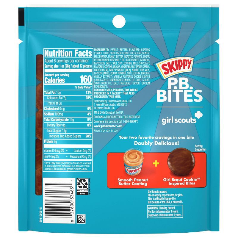 - One 5.5 oz. resealable pouch of SKIPPY PB Bites Girl Scout Chocolate Peanut Butter has about 6 servings per plastic pouch.