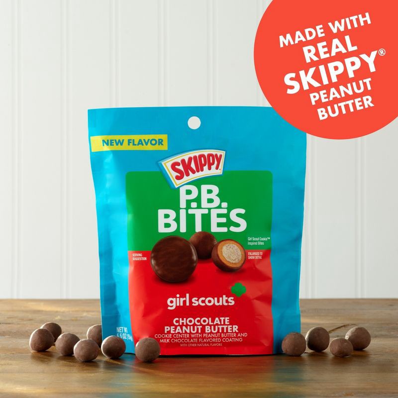 - SKIPPY PB Bites Girl Scout Chocolate Peanut Butter has a vanilla cookie center, rolled in SKIPPY Peanut Butter coating, rolled in milk chocolatey coating for an impressive snack for impressive #adulting