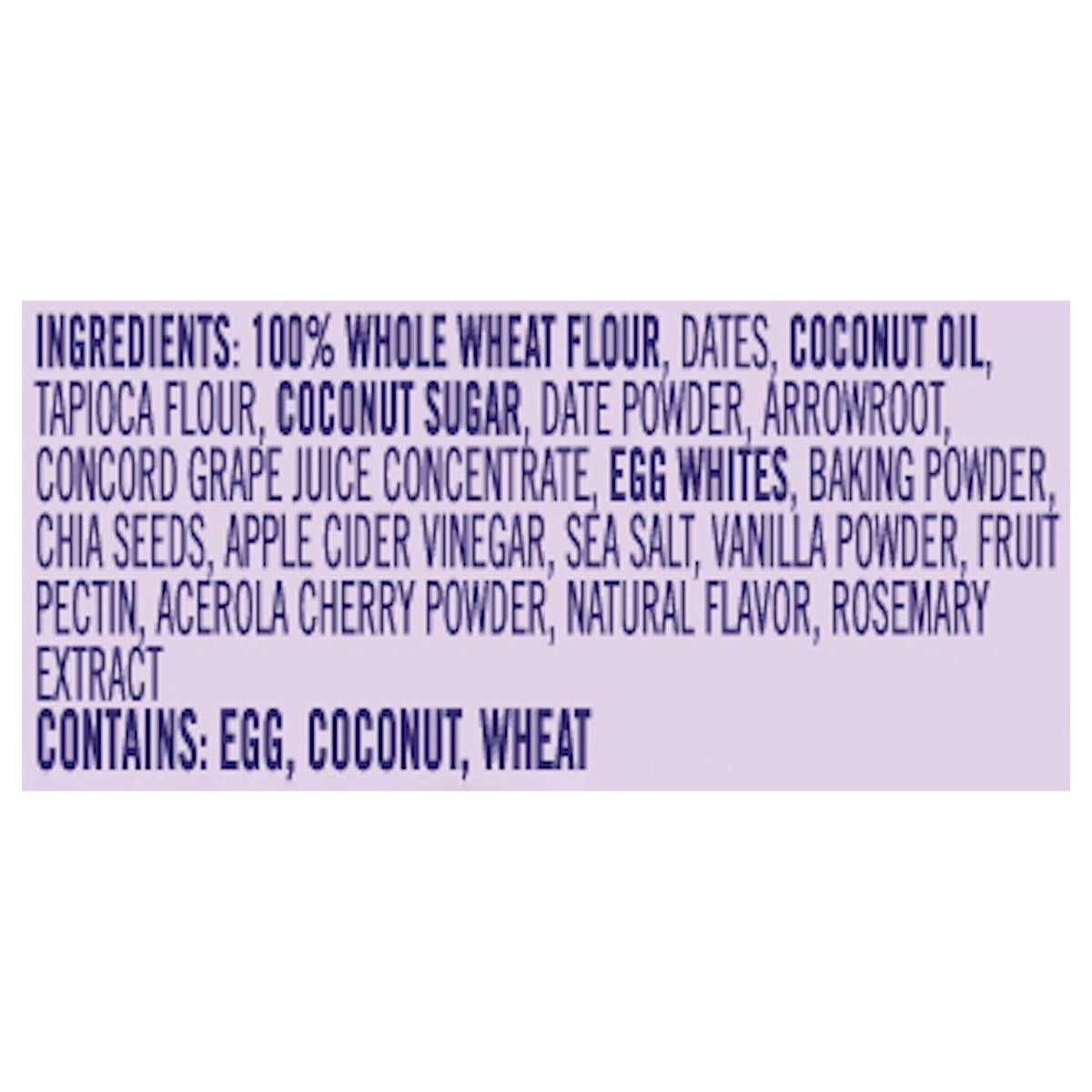 100% Whole Wheat Flour, Dates, Coconut Oil, Tapioca Flour, Coconut Sugar, Date Powder, Arrowroot, Concord Grape Juice Concentrate, Egg Whites, Baking Powder, Chia Seeds, Apple Cider Vinegar, Sea Salt,…