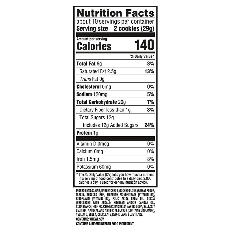 SUGAR, UNBLEACHED ENRICHED FLOUR (WHEAT FLOUR, NIACIN, REDUCED IRON, THIAMINE MONONITRATE [VITAMIN B1], RIBOFLAVIN [VITAMIN B2], FOLIC ACID), PALM OIL, COCOA (PROCESSED WITH ALKALI), SOYBEAN AND/OR CA…