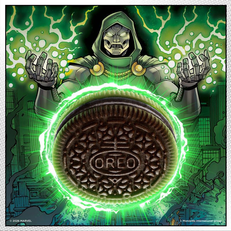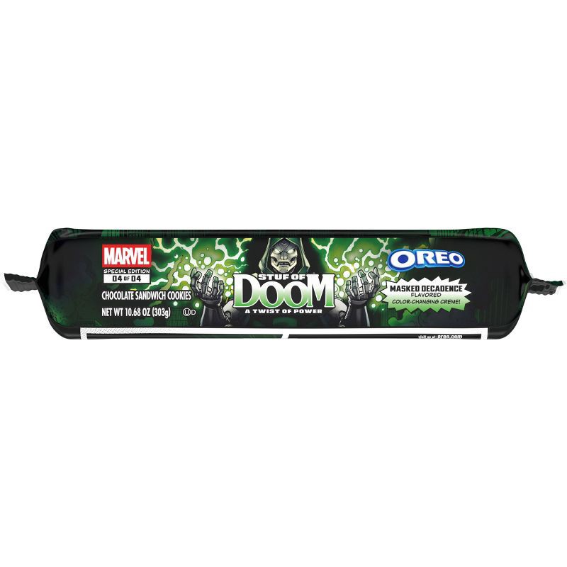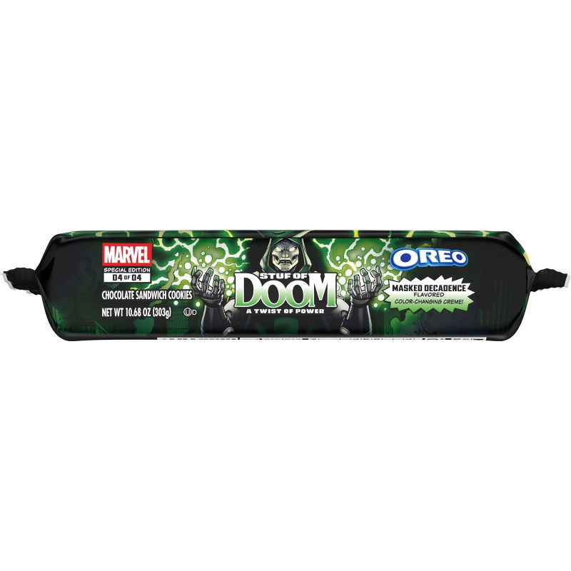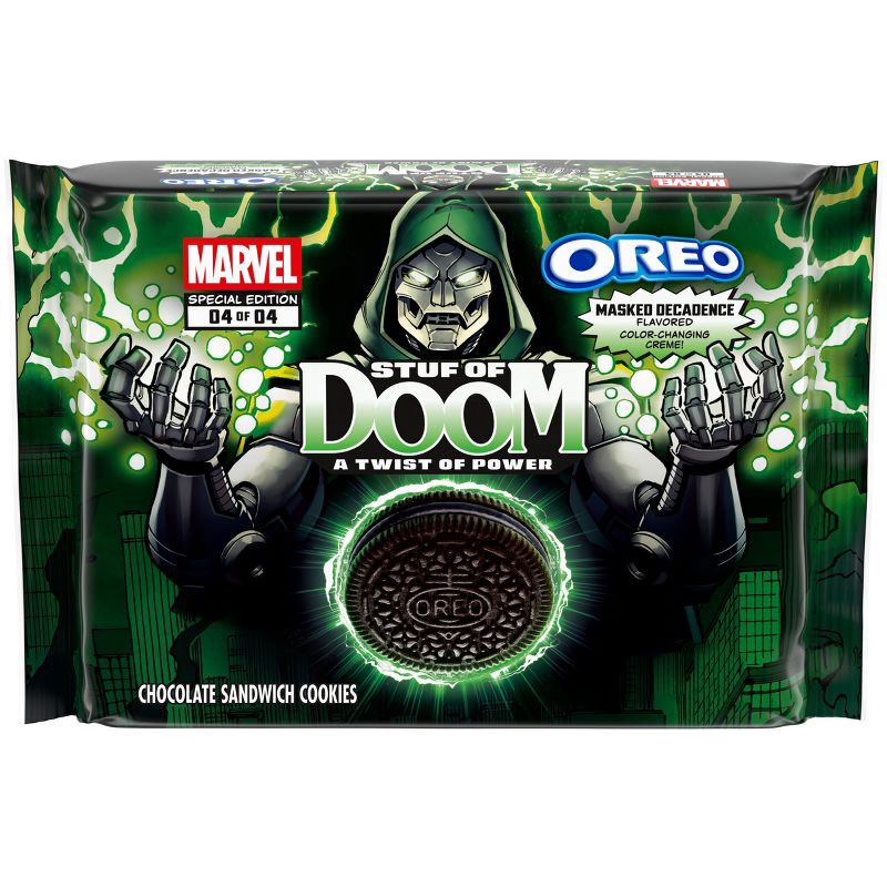 - OREO chocolate wafer cookies in fourth and final unique MARVEL OREO Stuf of Doom cookie pack; cookie design featuring a Marvel Legends Doctor Doom embossment