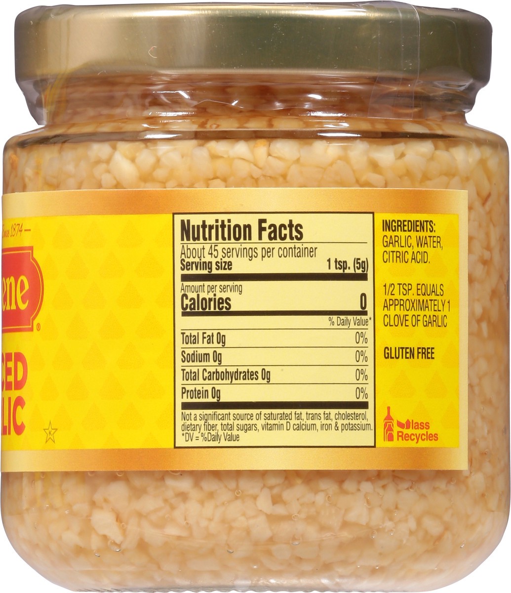 Family owned since 1874. 1/2 tsp. equals approximately 1 clove of garlic. Recycles.