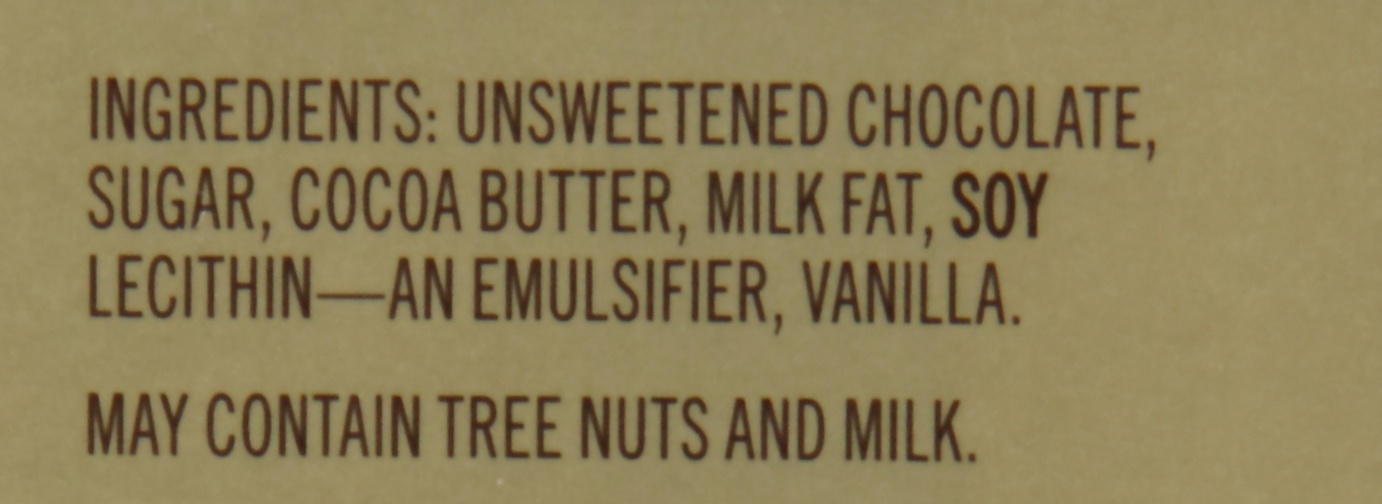 Unsweetened Chocolate\, Cane Sugar\, Cocoa Butter\, Milk Fat\, Soy Lecithin\, Vanilla Extract.