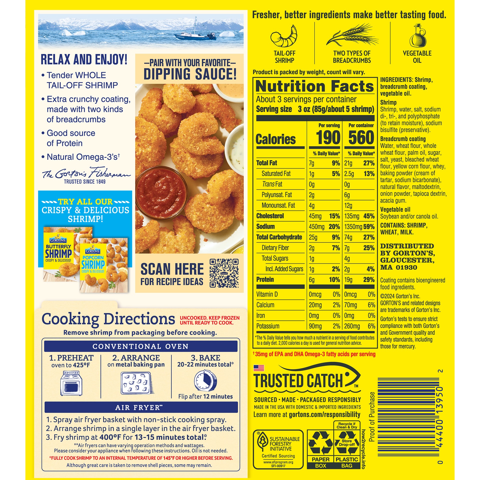SHRIMP, BREADCRUMB COATING, VEGETABLE OIL. SHRIMP: SHRIMP, WATER, SALT, DI-, TRI-, AND POLYPHOSPHATE (TO RETAIN MOISTURE), SODIUM BISULFITE (PRESERVATIVE). BREADCRUMB COATING: WATER, WHEAT FLOUR, WHOL…
