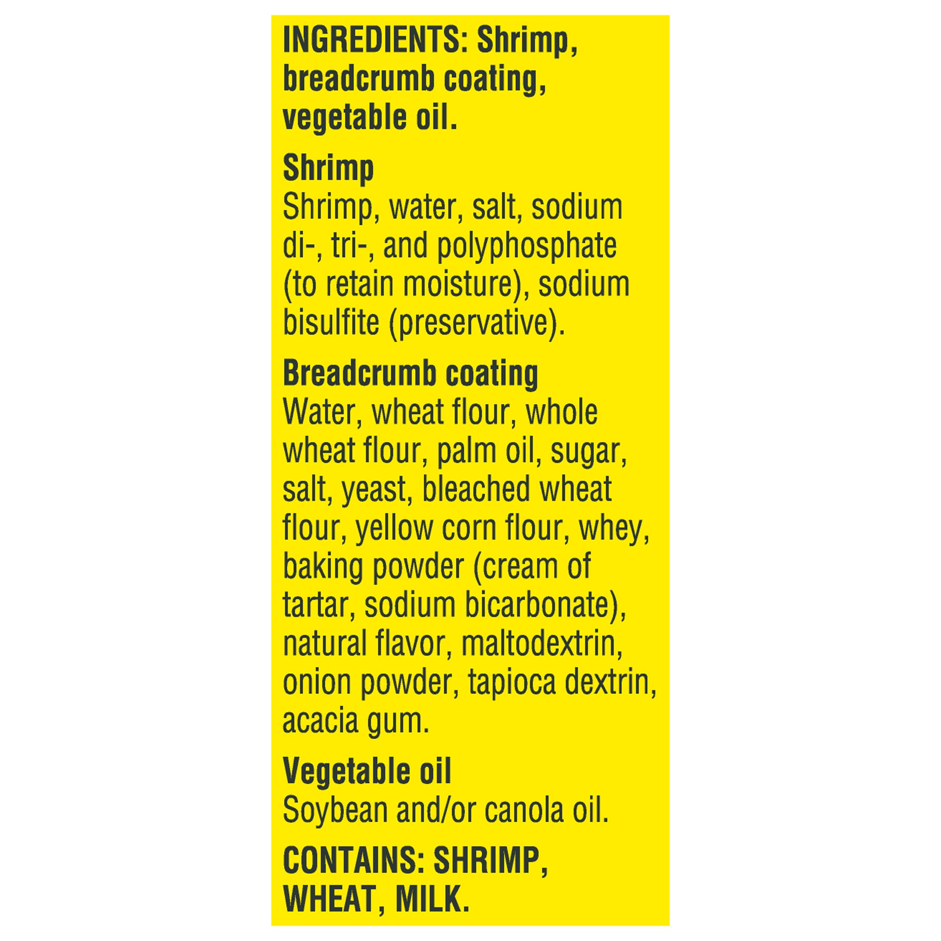 Shrimp, Breadcrumb Coating, Vegetable Oil, Shrimp: Shrimp, Water, Salt, Sodium Di-, Tri-, and Polyphosphate (to Retain Moisture), Sodium Bisulfite (Preservative), Breadcrumb Coating: Water, Wheat Flou…