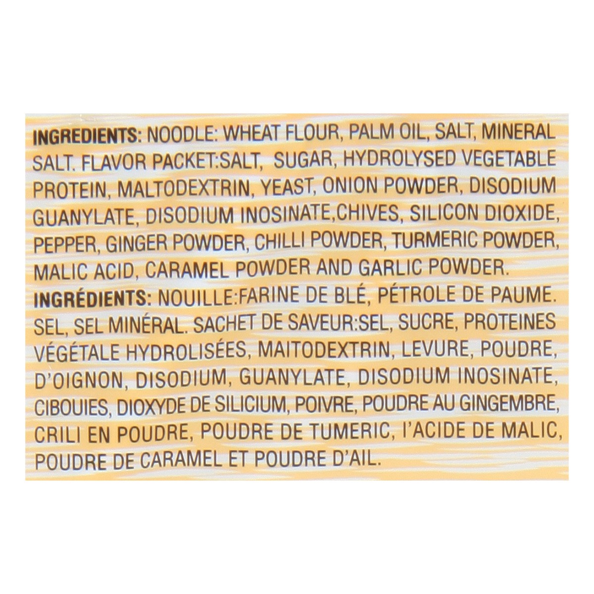 Noodle: Wheat Flour, Palm Oil, Salt, Mineral Salt, Flavor Packet: Salt, Sugar, Hydrolysed Vegetable Protein, Maltodextrin, Yeast, Onion Powder, Disodium Guanylate, Disodium Inosinate, Chives, Silicon …