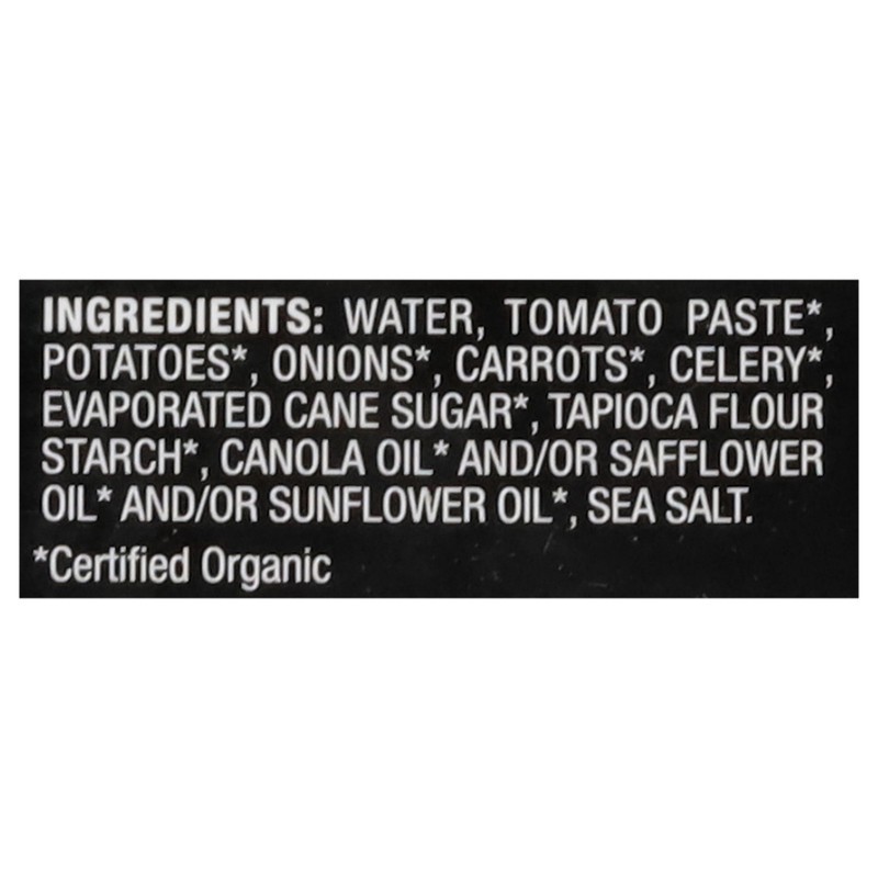 Water, Tomato Paste (Certified Organic), Onions (Certified Organic), Celery (Certified Organic), Potatoes (Certified Organic), Carrots (Certified Organic), Evaporated Cane Sugar (Certified Organic), T…