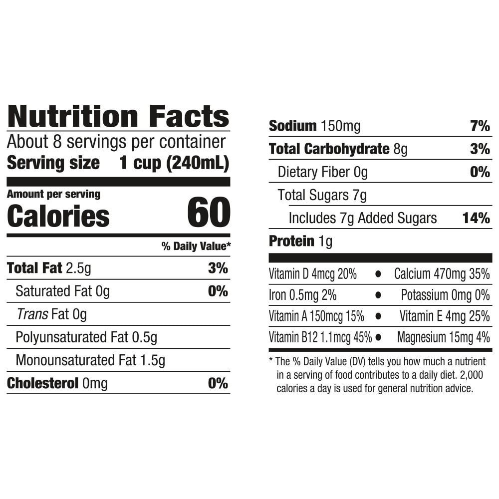 Almondmilk (Filtered Water, Almonds), Cane Sugar, Vitamin and Mineral Blend (Calcium Carbonate, Vitamin E Acetate, Vitamin A Palmitate, Vitamin D2), Sea Salt, Gellan Gum, Sunflower Lecithin, Locust Be…