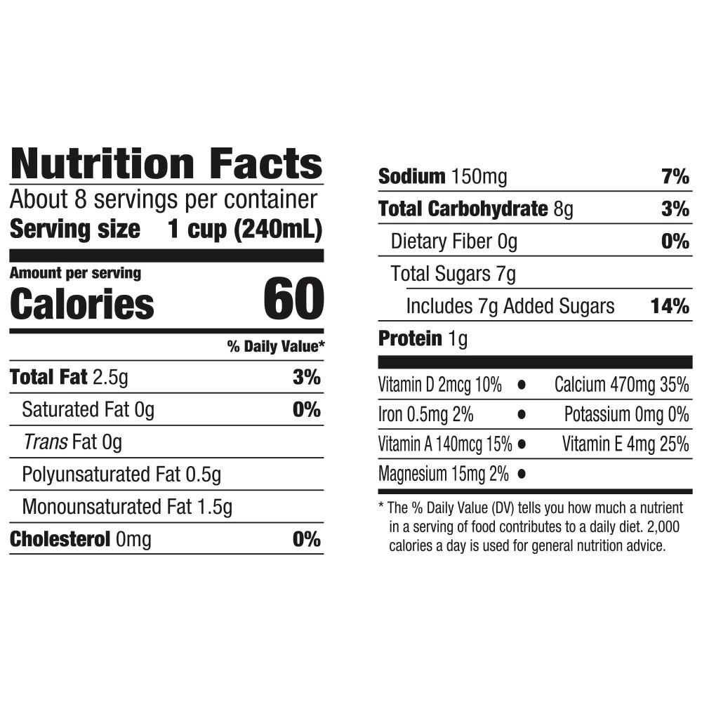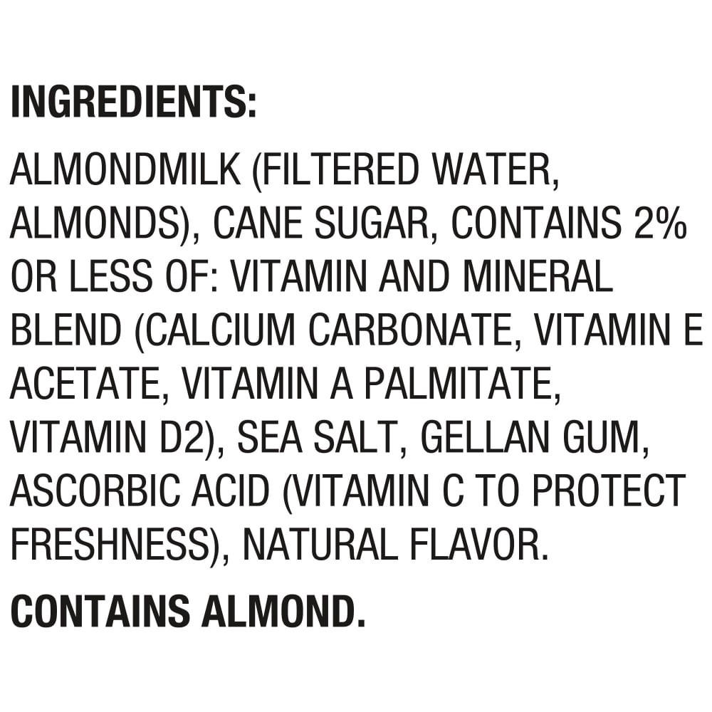 Almondmilk (Filtered Water, Almonds), Cane Sugar, Vitamin and Mineral Blend (Calcium Carbonate, Vitamin E Acetate, Vitamin A Palmitate, Vitamin D2), Sea Salt, Gellan Gum, Sunflower Lecithin, Locust Be…