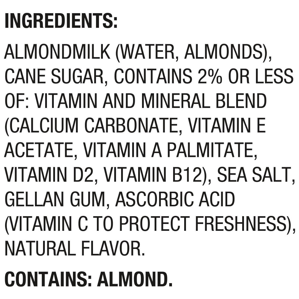 Almondmilk (Filtered Water, Almonds), Cane Sugar, Vitamin and Mineral Blend (Calcium Carbonate, Vitamin E Acetate, Vitamin A Palmitate, Vitamin D2), Sea Salt, Gellan Gum, Sunflower Lecithin, Locust Be…
