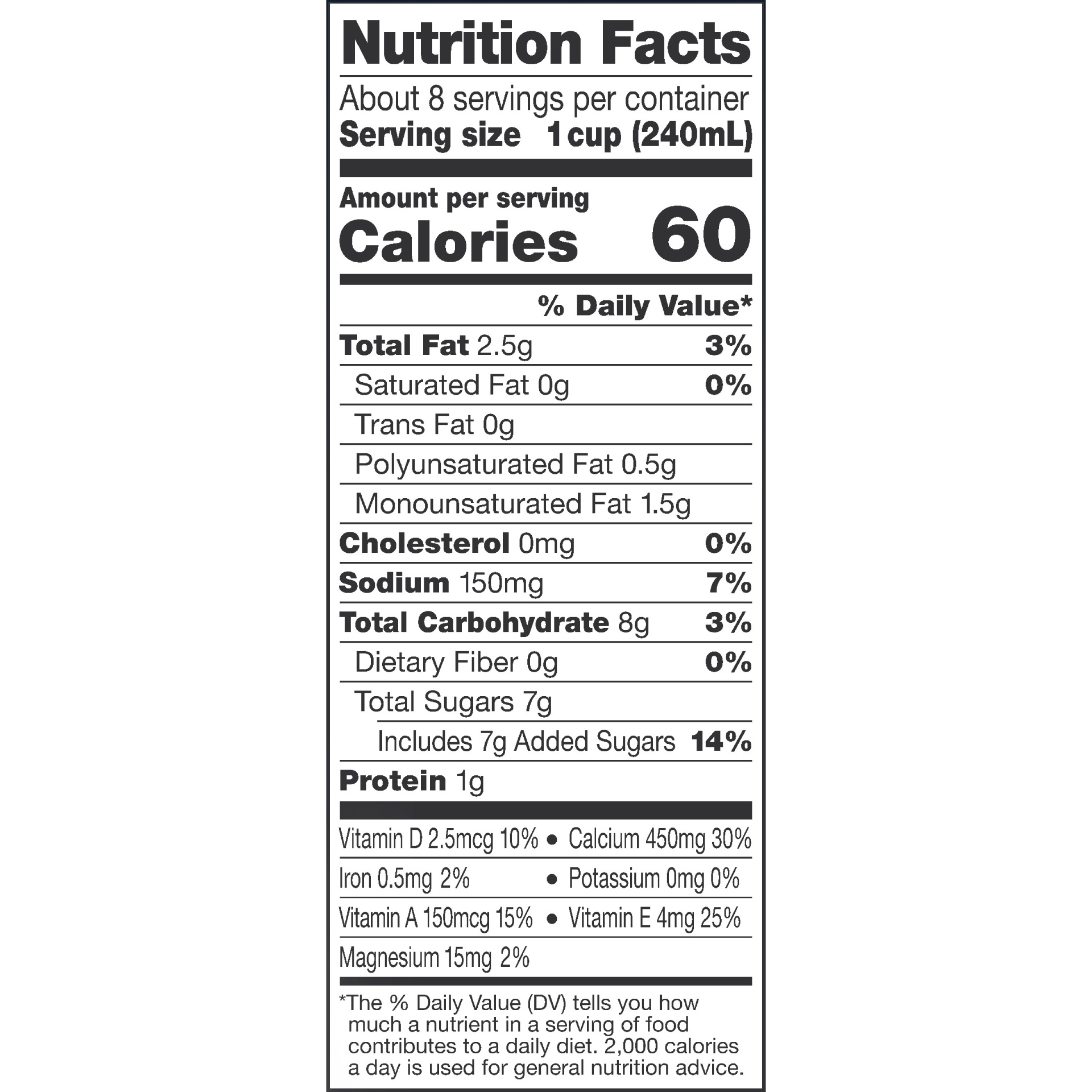 Almondmilk (Filtered Water, Almonds), Cane Sugar, Vitamin and Mineral Blend (Calcium Carbonate, Vitamin E Acetate, Vitamin A Palmitate, Vitamin D2), Sea Salt, Gellan Gum, Sunflower Lecithin, Locust Be…