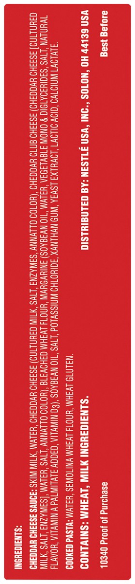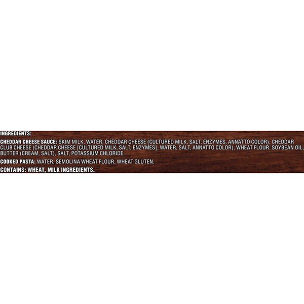 COOKED MACARONI (WATER, SEMOLINA WHEAT FLOUR, WHEAT GLUTEN), SKIM MILK, WATER, CHEDDAR CHEESE (CULTURED MILK, SALT, ENZYMES, ANNATTO COLOR), CHEDDAR CLUB CHEESE (CHEDDAR CHEESE [CULTURED MILK, SALT, E…