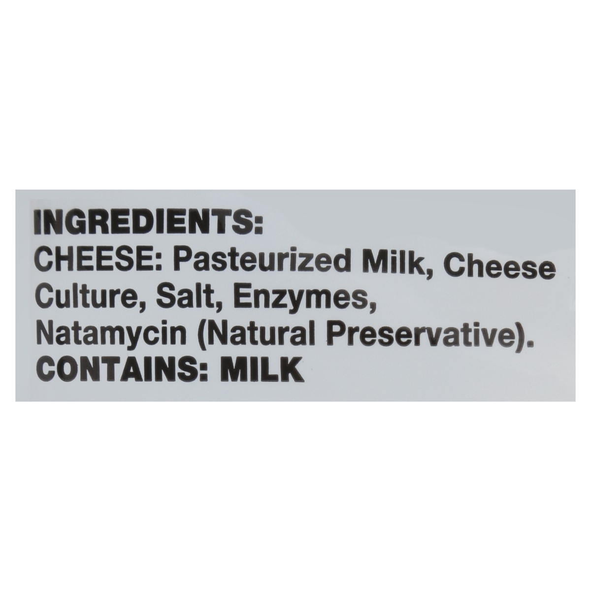 Cheese: Pasteurized Milk, Cheese Culture, Salt, Enzymes, Natamycin (Natural Preservative).