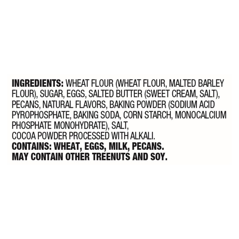 Wheat Flour (Wheat Flour, Malted Barley Flour), Sugar, Eggs, Salted Butter (Sweet Cream, Salt), Pecans, Natural Flavors, Baking Powder (Sodium Acid Pyrophosphate, Baking Soda, Corn Starch, Monocalcium…